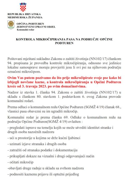 „Poštovani mještani, sukladno Zakonu o zaštiti životinja (NN102/17) člankom 94. propisana je provedba kontrole mikročipiranja, odnosno sve jedinice lokalne samouprave moraju provjeriti jesu li svi psi na njihovom području označeni mikročipom. Ovim Vas putem pozivamo da što prije mikročipirate svoje pse kako bi izbjegli novčane kazne, a kontrola mikročipiranja u Općini Podturen kreće od 3. travnja 2023. po svim domaćinstvima“.