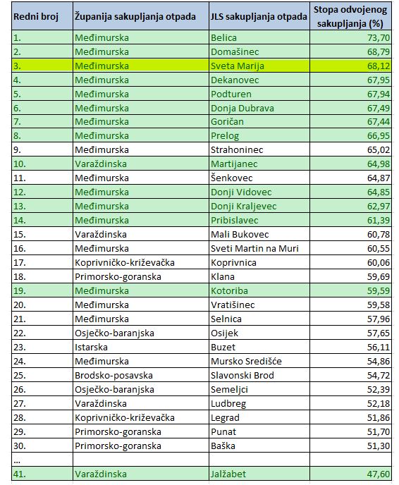 Prema izvješću Ministarstva zaštite okoliša i zelene tranzicije RH za 2023. godinu, Međimurska županija i dalje je vodeća u Hrvatskoj u odvojenom sakupljanju otpada. Na prvom mjestu u tome je, već četvrtu godinu za redom, Općina Belica (73,70 posto), na drugom mjestu ove je godine Općina Domašinec (68,79 posto), a na trećem Općina Sveta Marija (68,12 posto).