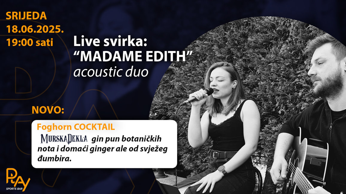 Glazbenu kulisu stvarat će Madame Edith, akustični duo kojeg čine Ivana (vokal) i Teo (gitara). U njihovom repertoaru nalaze se pažljivo odabrane obrade domaćih i stranih rock i pop hitova – od Skunk Anansie, Fleetwood Maca, Bishopa Briggsa i Musea, do Urbana, Flarea i Majki. Spajaju emociju i energiju, stvarajući intimnu, ali uzbudljivu atmosferu savršenu za opuštanje na toploj ljetnoj večeri.