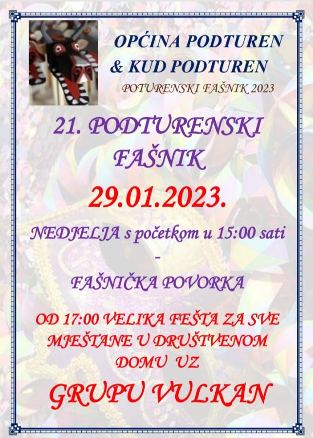 Fašnik započinje povorkom koja kreće ispred trgovine Kitro u Podturnu u 15 sati, dok će u 17 sati održati velika zabava za sve u Društvenom domu u Podturnu, uz veliku gastronomsku ponudu (neće manjkati kobasica!) i živu glazbu – koncert grupe Vulkan! Za sve maškare osigurani su i besplatni čaj, kuhano vino, sokovi i krafne, a očekuje se velik odaziv mještana, ali i maškara iz susjednih a čak i udaljenijih općina, jer ovakav se fašnik jednostavno ne propušta.