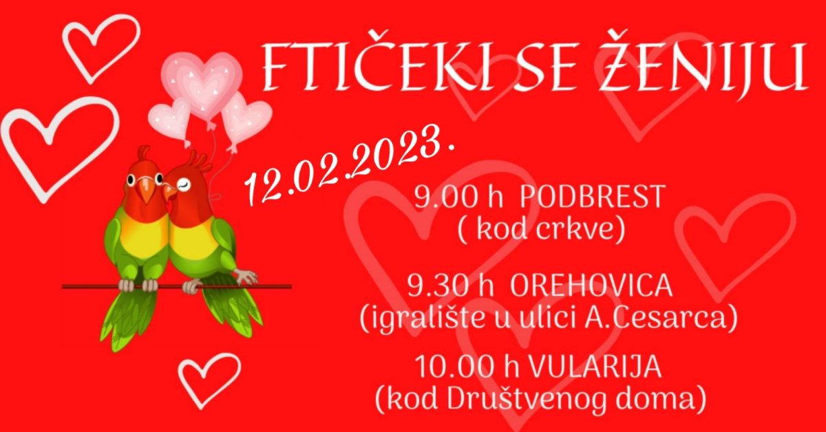 Povodom Valentinova, koje se Međimurju tradicionalno obilježava događajem ‘Ftičeki se ženijo’, Društvo Naša djeca Općine Orehovica u suradnji s Općinom Orehovica organizira ove nedjelje, 12. veljače 2023. godine, veseli događaj za djecu istoimenog naziva.