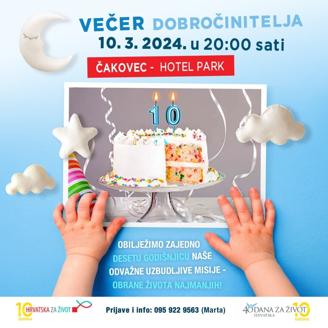 Večer dobročinitelja inicijative „40 dana za život“ održat će se u nedjelju, 10. ožujka, u 20 sati u čakovečkom hotelu Park, prenosi Varaždinska biskupija. Na susretu će nacionalni tim Inicijative svjedočiti o plodovima proteklih 10 godina inicijative.