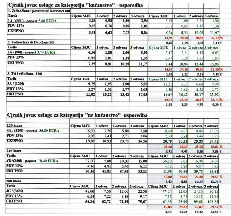 U sličnim postocima poskupljuju i cijene za kategorije ne-kućanstvo sa spremnicima pd 120, 240 i 360 litara. Sve cijene pogledjate u tablici Pre-koma ovdje: