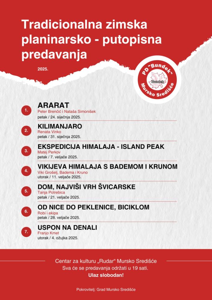 Od siječnja do ožujka u Centru za kulturu „Rudar“ u Murskom Središću već tradicionalno petkom održavaju se putopisna predavanja u organizaciji Planinarskog društva Bundek.