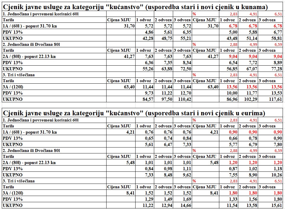 – Od 1. svibnja 2022. godine došlo je do poskupljenja odlaganja miješanog komunalnog otpada 20 %, a dodatno 1. siječnja 2023. odlaganje miješanog komunalnog otpada poskupljuje za dodatnih 9,3%. Iz tog razloga prisiljeni smo povećati samo varijabilni dio cijene za jednu predaju miješanog otpada za spremnik od 60 litara za 1,06 kn bez PDV-a, za jednu predaju spremnika od 80 litara za 1,41 kn bez PDV-a, a za jednu predaju spremnika od 120 litara za 2,12 kn bez PDV-a – stoji na stranicama Pre-koma.