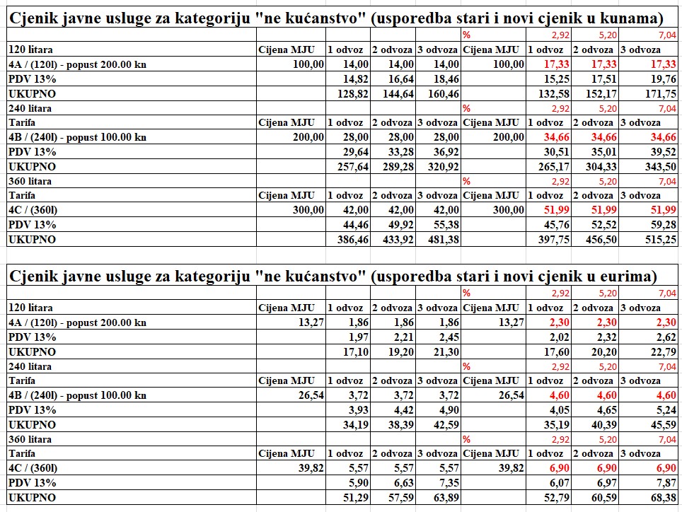 Ista je stvar i s kategorijom „ne kućanstvo“. Tu se varijabilni dio cijene za jednu predaju miješanog otpada za spremnik od 120 litara povisuje za 3,33 kn bez PDV-a, za jednu predaju spremnika od 240 litara za 6,66kn bez PDV-a, a za jednu predaju spremnika od 360 litara za 9,99 kn bez PDV-a.