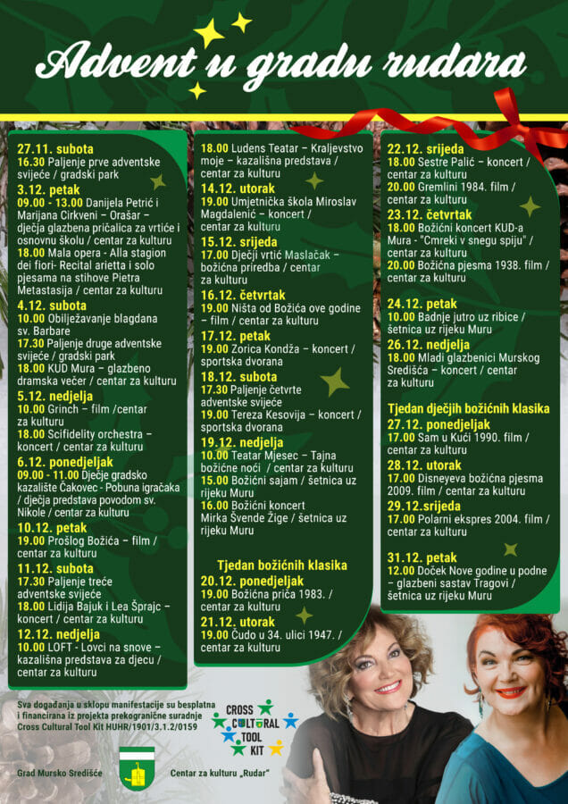 Advent u gradu rudara izrasta u tradicionalnu manifestaciju koja svake godine plijeni novim sadržajima, a zahvaljujući uspješnom provođenju prekograničnog projekta financiranog iz fondova Europske unije, Grad Mursko Središće može si priuštiti i za građane u potpunosti besplatan sadržaj.