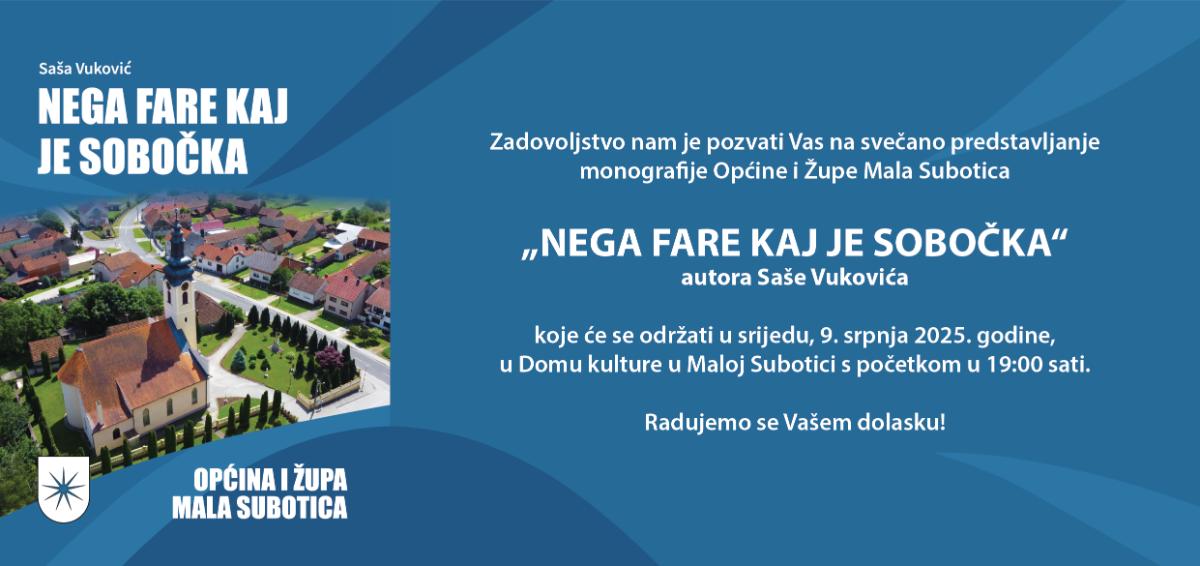 U sklopu ovogodišnjih Dana Općine Mala Subotica u srijedu, 9. srpnja 2025. godine, s početkom u 19:00 sati u Domu kulture u Maloj Subotici održat će se svečano predstavljanje nove monografije Općine i Župe Mala Subotica „Nega fare kaj je sobočka“ autora Saše Vukovića.