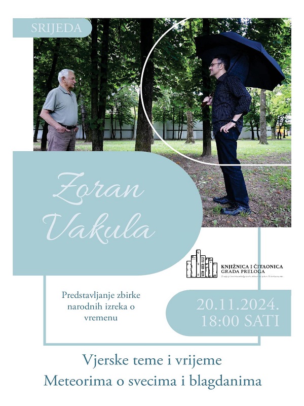 Knjižnica i čitaonica Grada Preloga poziva vas na promociju zbirke „Vjerske teme i vrijeme“, čiji je autor poznato TV lice, meteorolog i pisac za najmlađe Zoran Vakula. Ova jedinstvena zbirka okuplja mudrosti pučke meteorologije i znanstveno utemeljene prognoze o vremenskim prilikama i blagdanima, posvećujući se radu i nasljeđu legendarnog meteorologa mr. sc. Milana Sijerkovića. Zbirka nudi jedinstven pogled na stare narodne izreke, a istovremeno suvremene prognoze u stihu i rimi.
