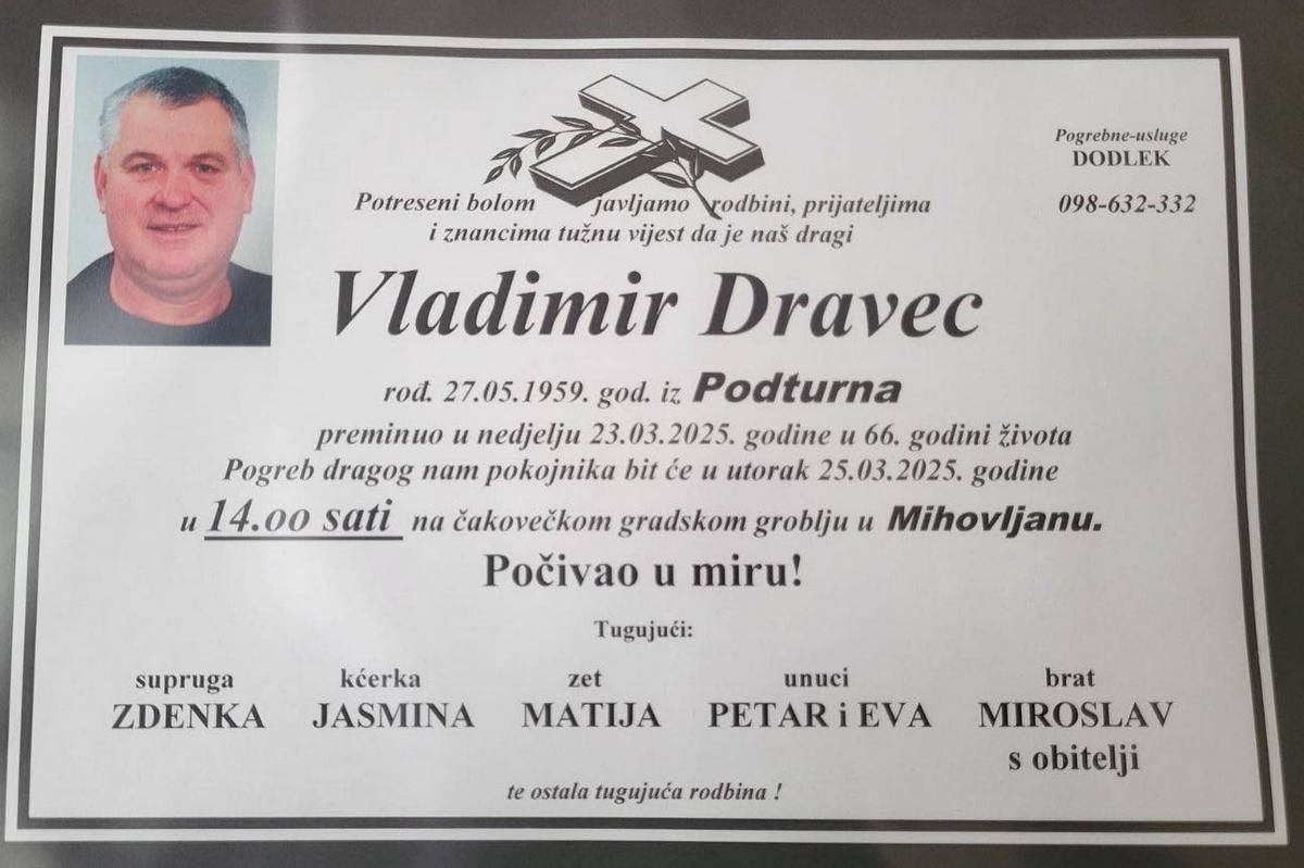 Vladimir Dravec iza sebe je ostavio ožalošćenu suprugu Zdenku, kćerku Jasminu i zeta Matiju, unuke Petra i Evu te brata Miroslava s obitelji.