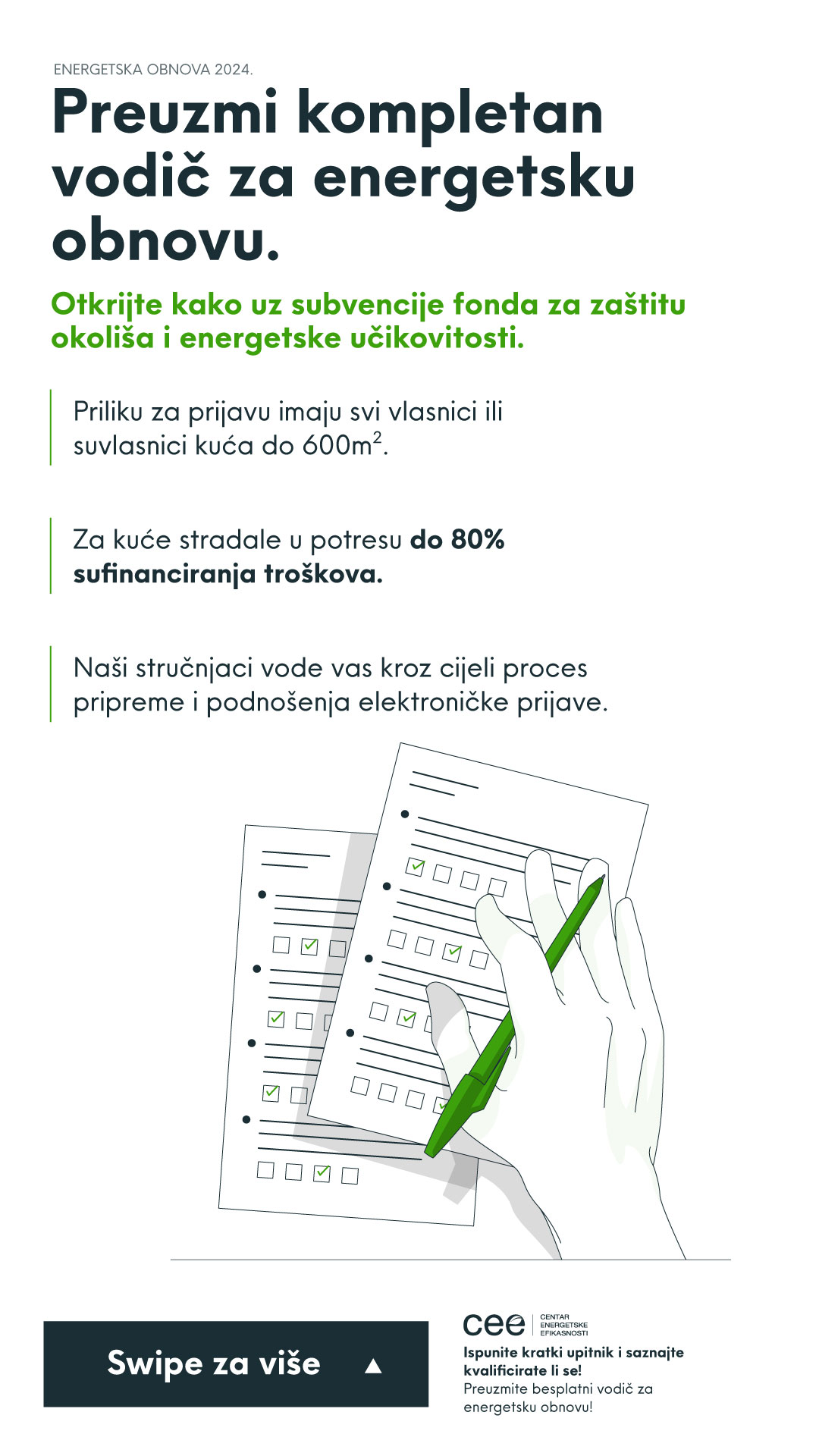 U sklopu natječaja Fonda za zaštitu okoliša i energetsku učinkovitost za 2024. godinu, nudimo vam priliku da unaprijedite svoj dom kroz energetsku obnovu. Kako bismo vam olakšali ovaj proces, pripremili smo detaljni “Vodič kroz energetsku obnovu” koji možete besplatno preuzeti na našoj web stranici https://www.cee.hr/obnova2024/.