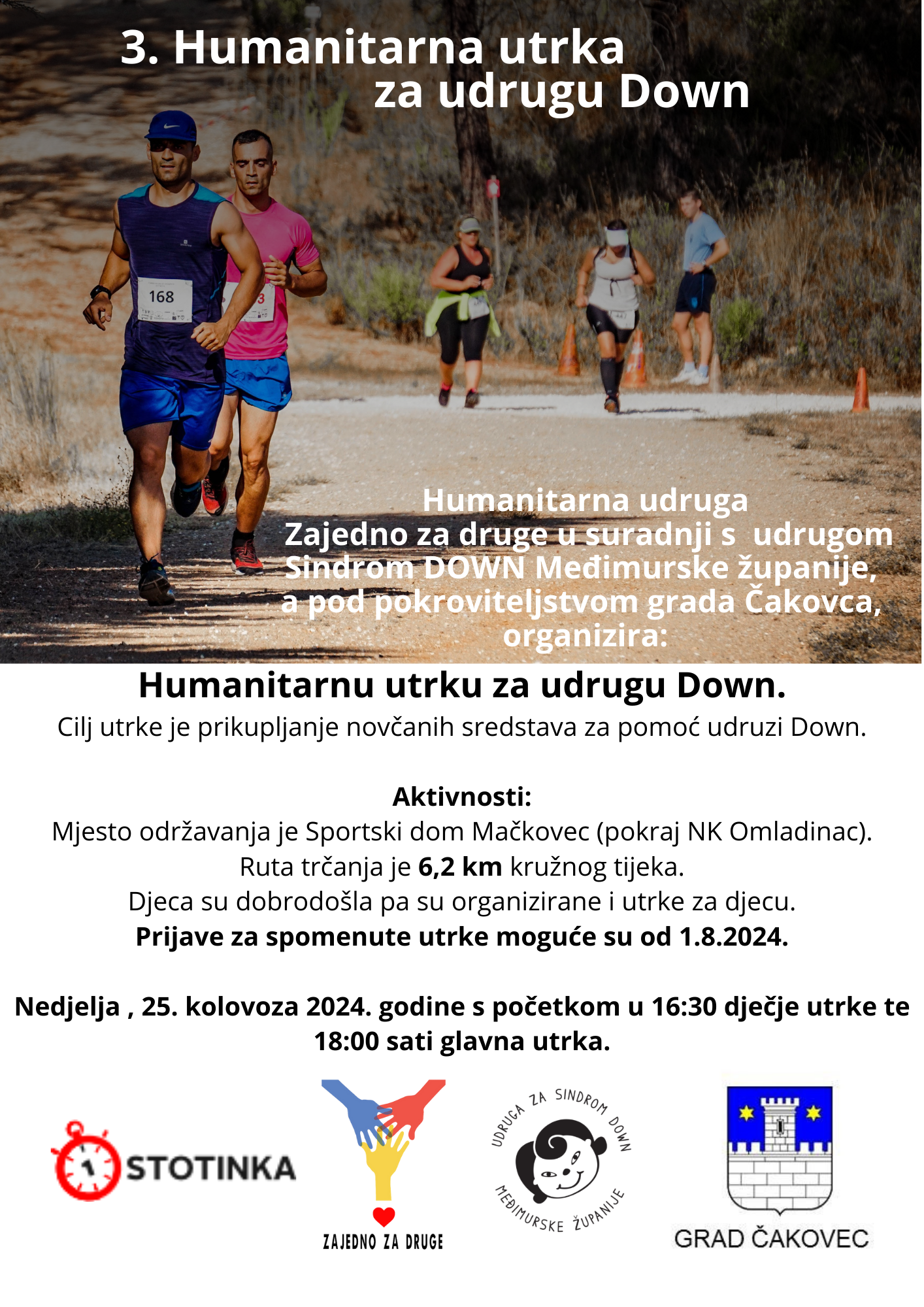 Udruga Zajedno za druge iz Mačkovca, u suradnji s Atletskim klubom Čakovec i Stotinkom, a pod pokroviteljstvom Grada Čakovca organizira 3. humanitarnu utrku za udrugu Down. Cilj utrke je prikupljanje novčanih sredstava za terapijsko jahanje i terapijsko penjanje za članove Udruge za sindrom DOWN Međimurske županije.