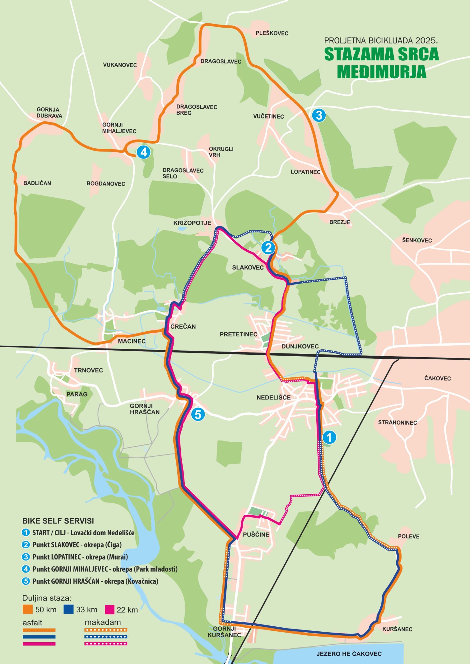 Staze su kombinacija asfaltiranih i makadamskih puteva, a na trasi su predviđene i točke za okrjepu u Gornjem Hrašćanu, Slakovcu, Gornjem Mihaljevcu, te Pleškovcu. Sudionici će po završetku vožnje uživati u zajedničkom ručku kod Lovačkog doma u Nedelišću.
