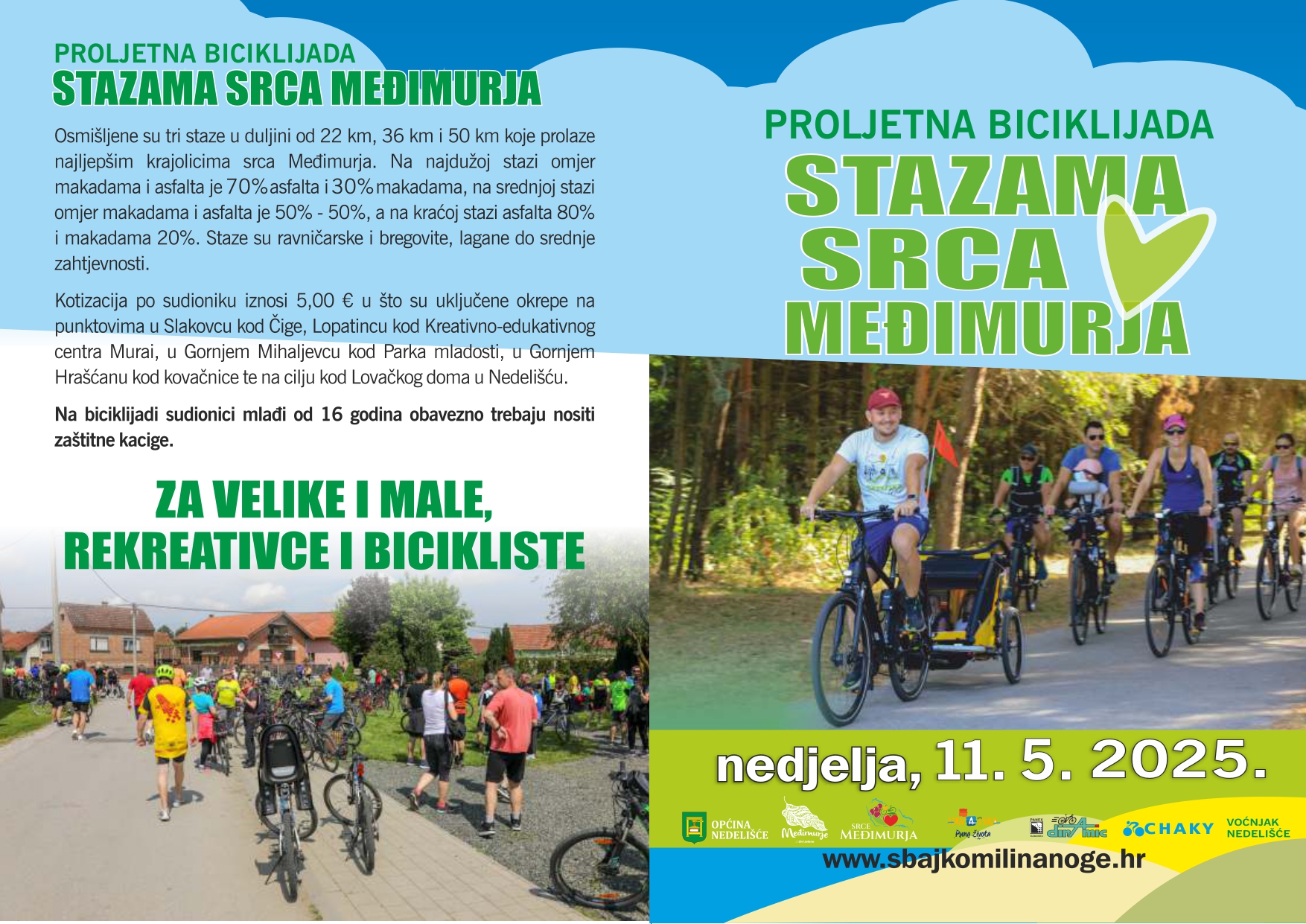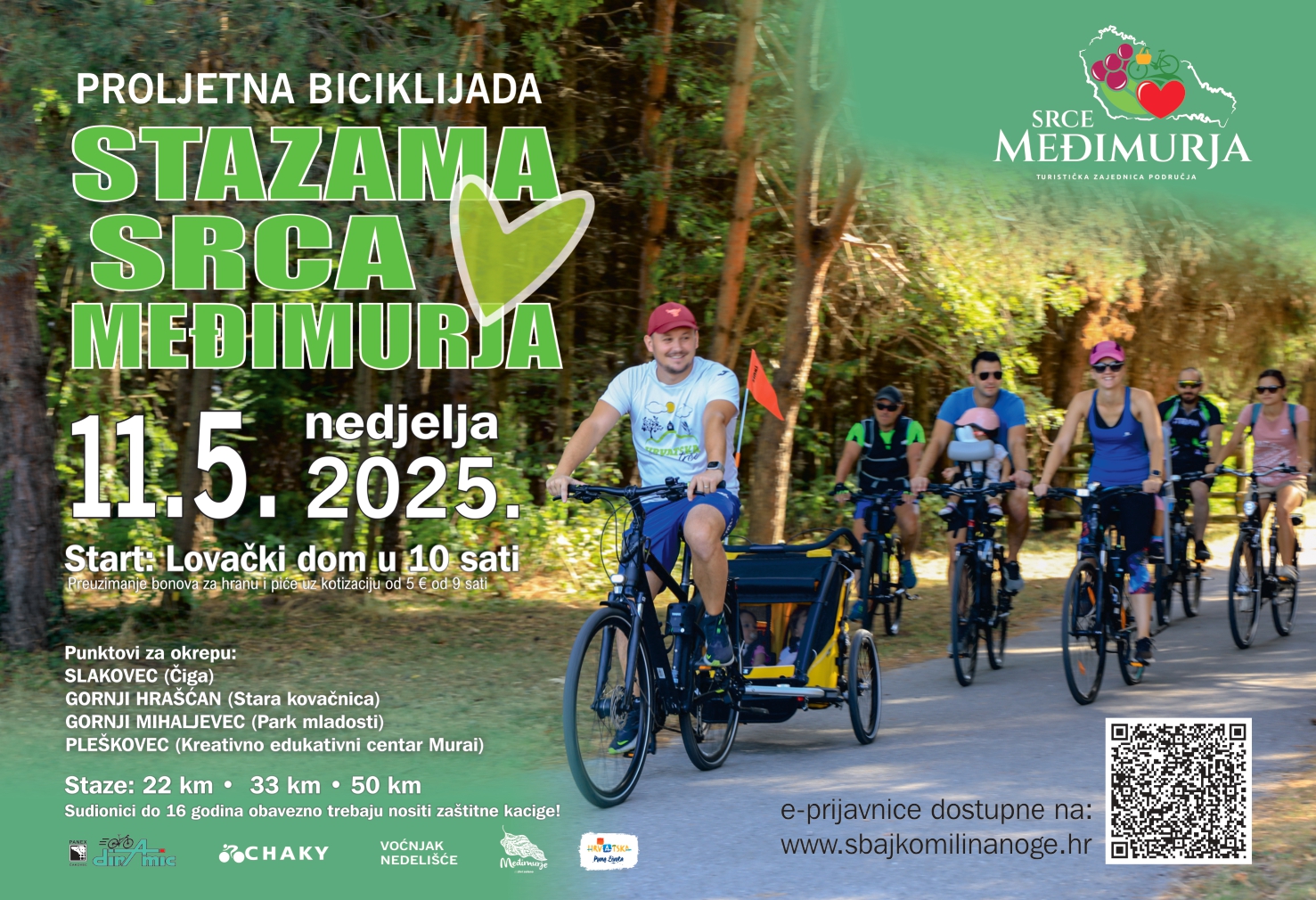 Turistička zajednica područja Srce Međimurja poziva sve rekreativce, bicikliste i ljubitelje prirode da se pridruže proljetnoj biciklijadi “Stazama Srca Međimurja”, koja će se održati u nedjelju, 11. svibnja 2025. godine s početkom u 10:00 sati, sa startom i ciljem u dvorištu Lovačkog doma u Nedelišću.