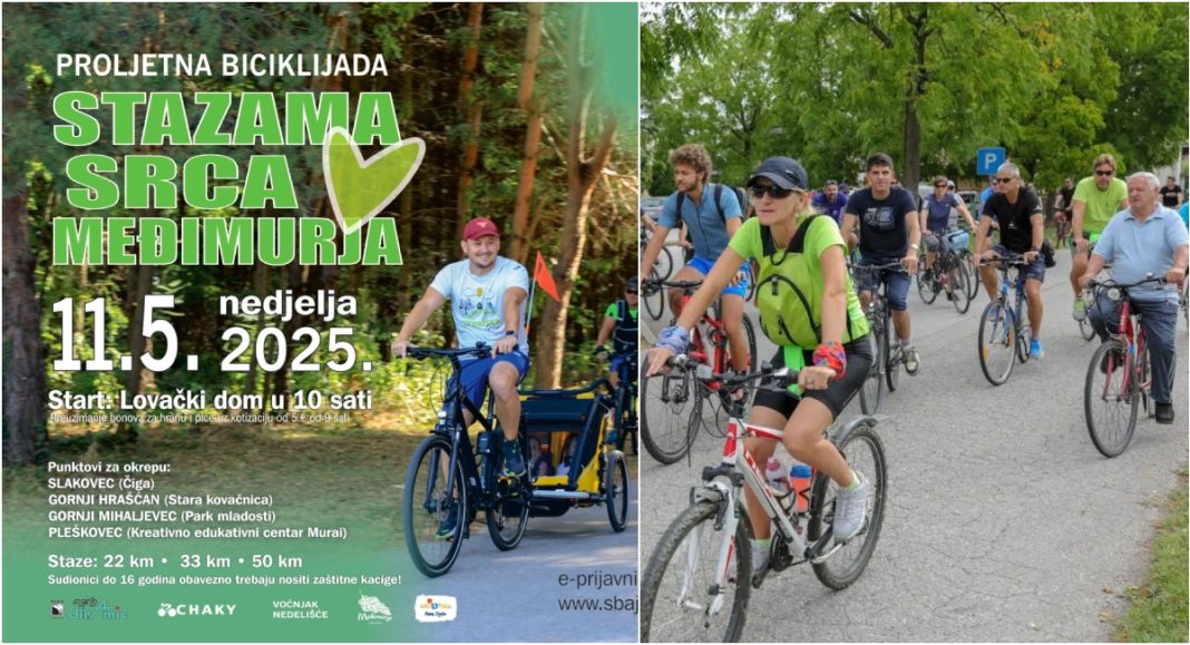 Turistička zajednica područja Srce Međimurja poziva sve rekreativce, bicikliste i ljubitelje prirode da se pridruže proljetnoj biciklijadi “Stazama Srca Međimurja”, koja će se održati u nedjelju, 11. svibnja 2025. godine s početkom u 10:00 sati, sa startom i ciljem u dvorištu Lovačkog doma u Nedelišću.