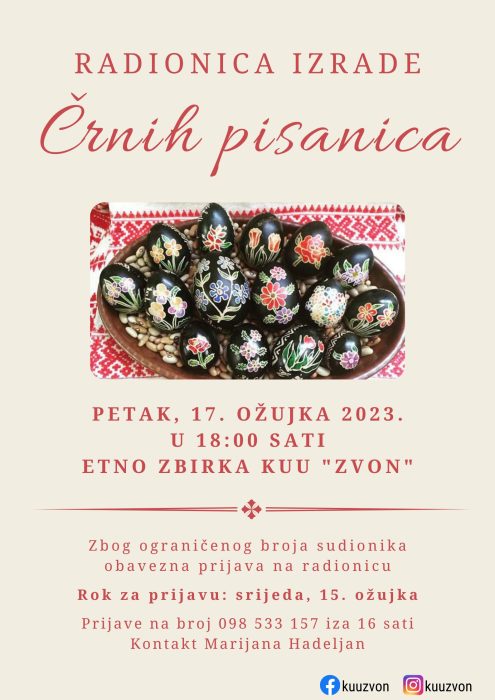 Kulturno umjetnička udruga “Zvon” poziva sve na radionicu izrade črnih pisanica koju je pripremila u suradnji s gospođom Biserkom Vučenik iz Donje Dubrave.