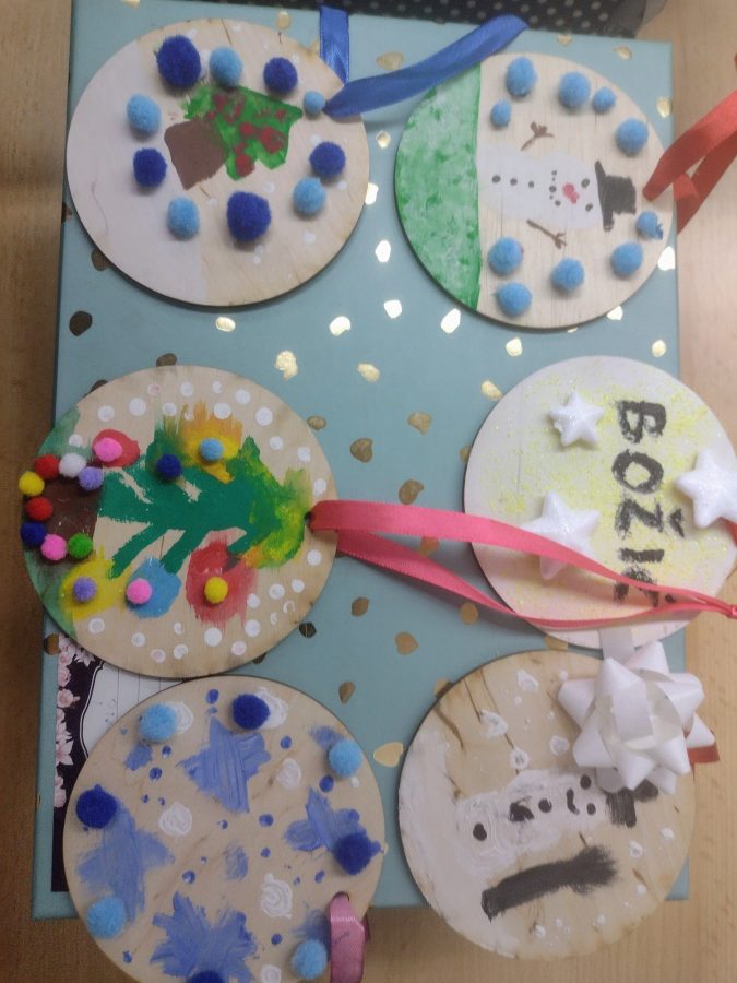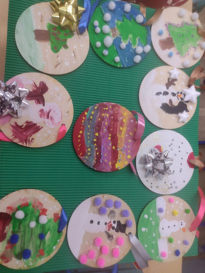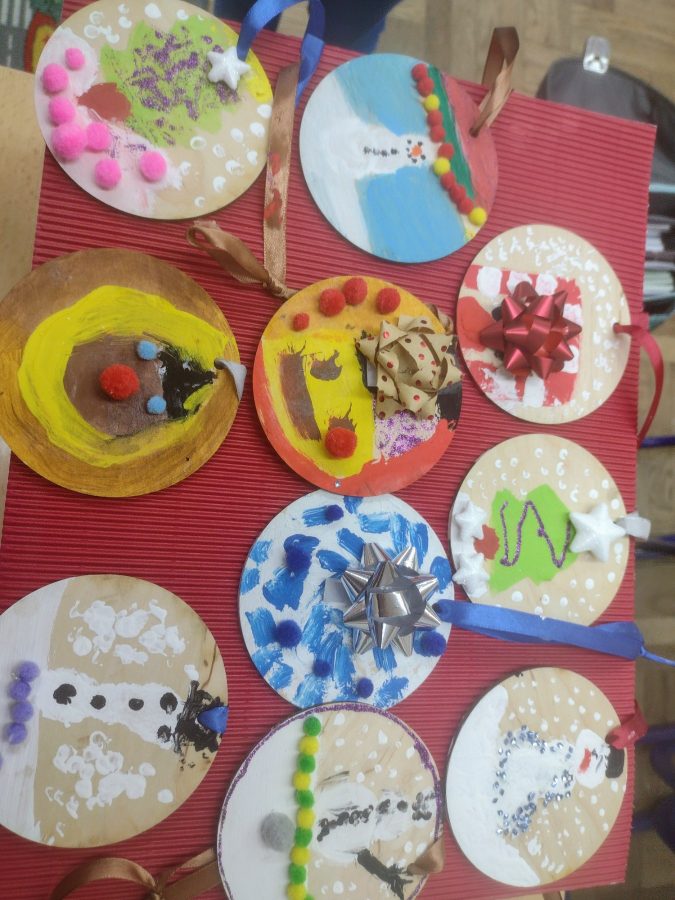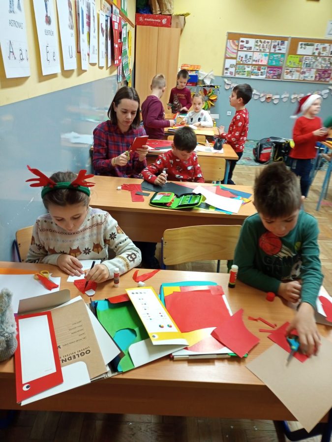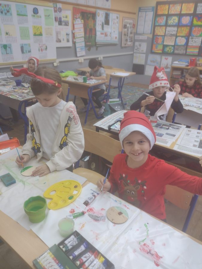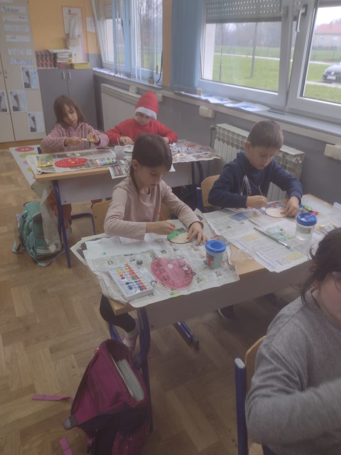 Prvi razred radio je čestitke za Božić i Novu godinu, a učenici drugog razreda, oslikavali su temperama drvene kugle kao ukras za bor. S velikim oduševljenjem i zanosom učenici su marno prionuli radu pokazujući svoju kreativnost .