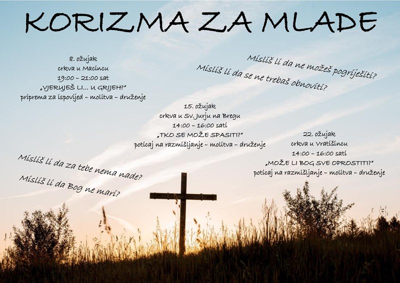 Štrigovski dekanat ove će godine organizirati 3 korizmene duhovne obnove za mlade. Prva će biti u crkvi u Macincu na temu “Vjeruješ li… u grijeh?” u subotu 8. ožujka od 19 do 21 sat, javljaju iz Varaždinske biskupije.