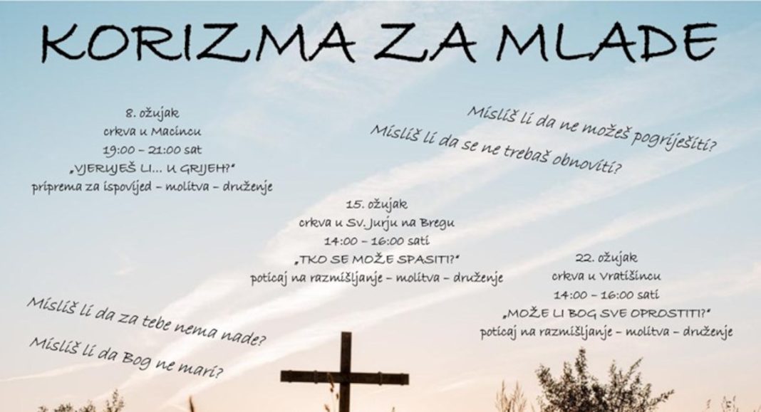 Štrigovski dekanat ove će godine organizirati 3 korizmene duhovne obnove za mlade. Prva će biti u crkvi u Macincu na temu “Vjeruješ li… u grijeh?” u subotu 8. ožujka od 19 do 21 sat, javljaju iz Varaždinske biskupije.