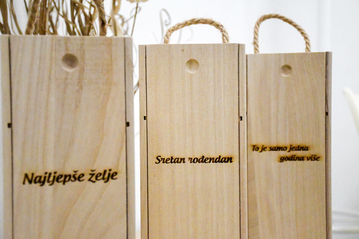Ukoliko tražite što pokloniti dragoj osobi u ponudi su osim originalnih poklon paketa poznatih brandova i prigodni poklon paketi kao i mogućnost da sami kreirate svoju posebnu poruku koja može biti na boci Muškatne penine od 3,0l ili ugravirano na drvenoj kutiji za butelju ili metalnoj pljosci za žestoko piće.