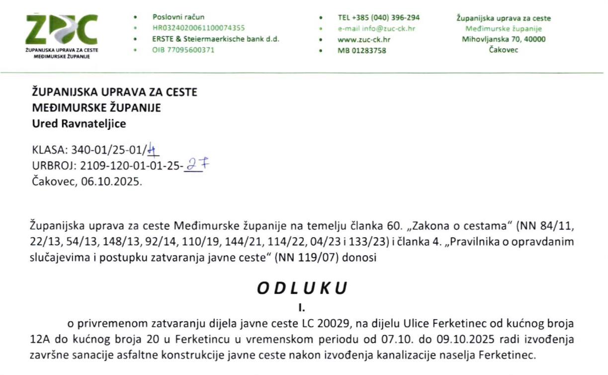 Zatvara se dio Ulice Ferketine od kućnog broja 12A do kućnog broja 20 u Ferketincu, u vremenskom razdoblju od 7. do 9. listopada 2025. godine, zbog izvođenja završne sanacije asfaltne konstrukcije javne ceste nakon radova na kanalizaciji u naselju Ferketinec.