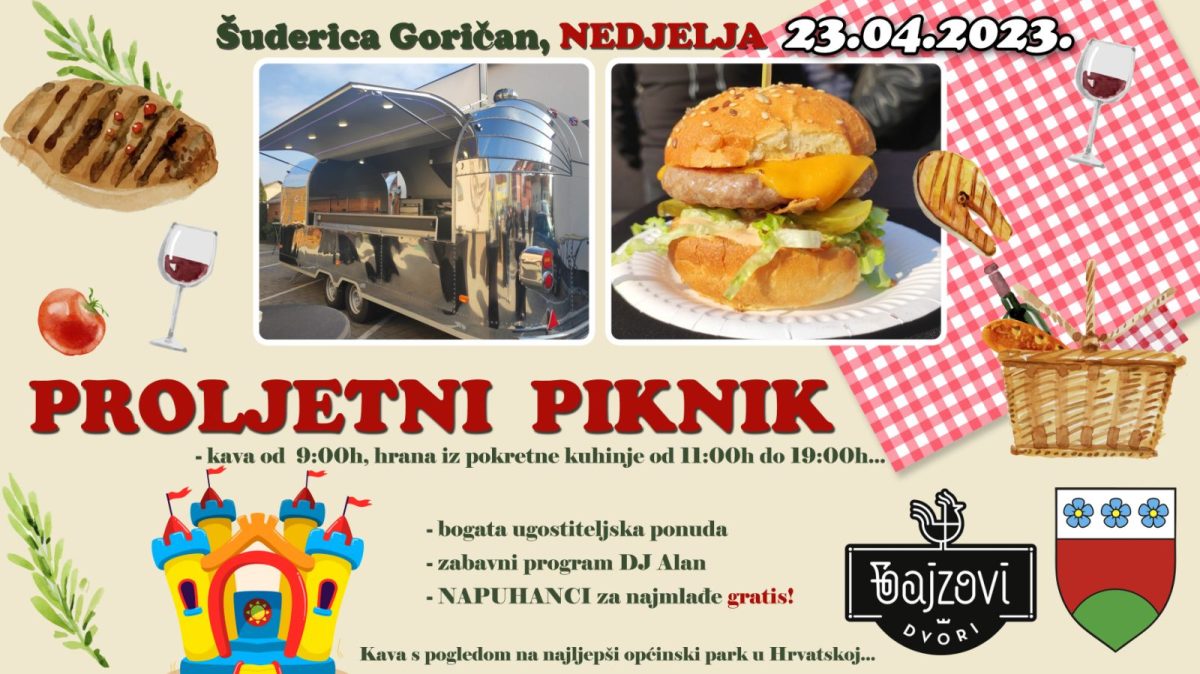 Ove nedjelje, 23. travnja 2023. godine, na parku Šuderica u Goričanu dođite na Proljetni piknik! Uz prekrasno jezero i boravak na svježem zraku, očekuje vas i bogata gastronomska ponuda iz pokretnog vozila Bajzovih dvora, glazba za koju će se pobrinuti DJ Alan te besplatna zabava na napuhancima za djecu!