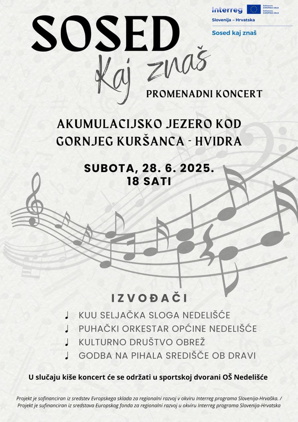 Pozivamo vas na cijelovečernji promenadni koncert pod nazivom Sosed, pokaži kaj znaš koji će se održati u predivnom prirodnom ozračju na Akumulacijskom jezeru kod Gornjeg Kuršanca.