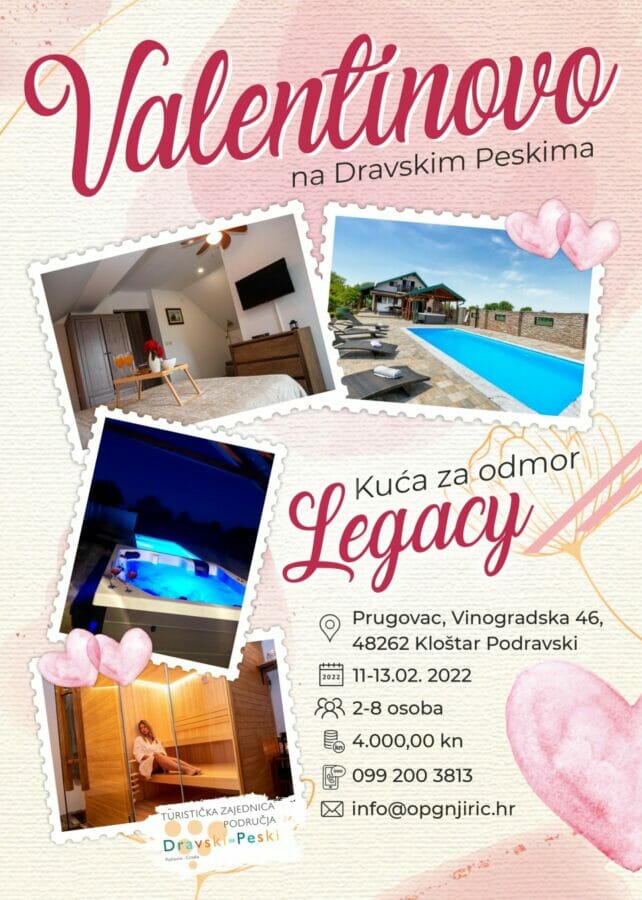 Kuća za odmor Legacy nalazi se u malenom mjestu Prugovac, podno obronaka Bilogore te svega nekoliko kilometara od europske Amazone – predivne rijeke Drave. Kuća je kapaciteta 8 osoba raspoređenih u tri sobe. U dvorištu na raspolaganju su brojni sadržaji poput bazena, jacuzzija, dječjeg igrališta te ljetne terase s pečenjarom. Svaka soba ima svoju kupaonicu, tv i klimu. Gostima je također na raspolaganju sauna te dvije kuhinje za pripremu hrane. Kuća je smještena u vinogradarskom predjelu tako da ćete imati svoj zasluženi mir i tišinu. Ukoliko ipak odlučite malo aktivnije provesti svoj odmor, možete se provozati biciklom jednom od brojnih biciklističkih staza, otići na rafting, paintball, vožnju brodom ili jednostavno uživati u brojnim ljepotama destinacije Dravski Peski.