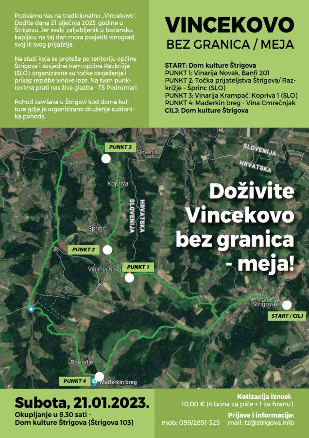 – ‘Kakvo bi to Vincekovo bilo da ne iskoristimo prednosti ulaska hrvatske u Schengenski prostor i da ne pređemo granicu Lijepe naše domovine. Trasa je objavljena na našem plakatu-pozivu i vidljivo je kako će ovo biti više nego zanimljivo pješačenje. Biti će i ugodnih i lijepih iznenađenja za sve putnike kroz bajkoviti kraj hrvatsko-slovenskog prostora. Ono što vam svima treba je topla odjeća, ugodna obuća , važeća osobna iskaznica i naravno puno dobre volje. Vidimo se u Štrigovi na nezaboravnom Vincekovom bez granica’!