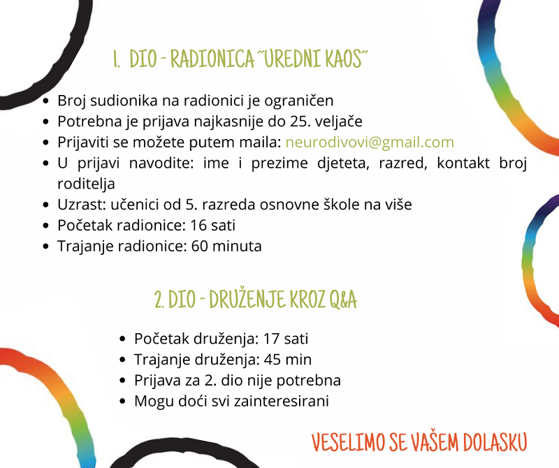 Uzrast: učenici od 5. razreda osnovne škole na više. Za drugi dio radionice, za Q&A vrata su otvorena svima i može se doći bez prijave. Prijaviti se možete putem maila na neurodivovi@gmail.com