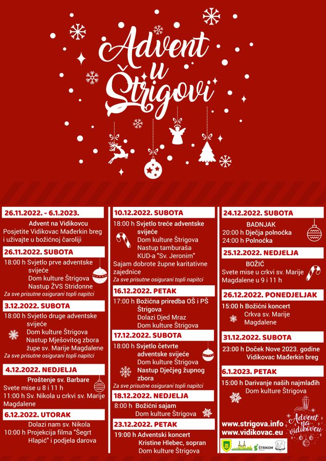 – ‘Advent u Štrigovi’ ove godine donosi brojna događanja. Adventsko razdoblje započinjemo paljenjem prve svijeće na Adventskom vijencu u subotu 26. studenog u 18 sati. Svijeće ćemo ove godine paliti kod Doma kulture Štrigova, što nam omogućuje održavanje u svim mogućim vremenskim uvjetima. Za sve koji dođu u to vrijeme na događaj pripremiti ćemo tople napitke. Istovremeno, odvijati će se Advent na Vidikovcu na Mađerkinom bregu, gdje posjetitelje očekuje posebna Božićna priča popraćena prigodnim osvjetljenjem i malim Božićnim sajmom koji će biti vikendima.