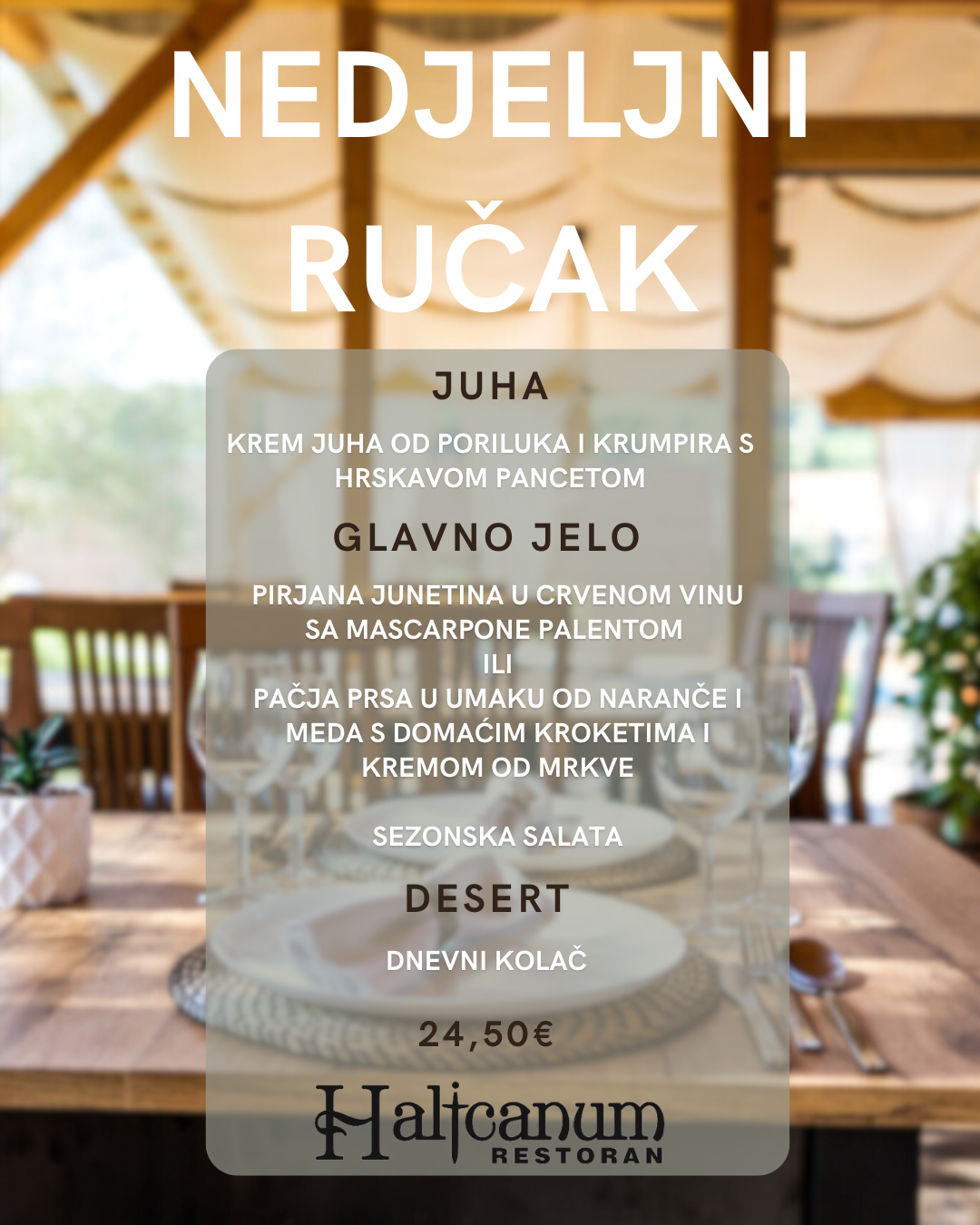 Za one koji uživaju u sporom nedjeljnom objedovanju, Halicanum nudi raskošan meni koji započinje krem juhom od poriluka i krumpira s hrskavom pancetom. Glavno jelo dolazi u dvije primamljive varijante: pirjana junetina u crvenom vinu sa mascarpone palentom ili pačja prsa u umaku od naranče i meda s domaćim krokietima i kremom od mrkve. Uz to dolazi sezonska salata, a za kraj desert – dnevni kolač. Cijena ovog gastronomskog doživljaja iznosi 24,50 €.