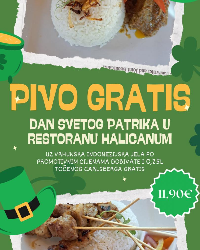 U duhu irskog nacionalnog praznika, Halicanum priprema posebnu ponudu inspiriranu indonezijskom kuhinjom. Gosti će moći uživati u vrhunskim jelima po promotivnim cijenama, a uz svako naručeno jelo dobit će i 0,25 litara točenog Carlsberg piva gratis. Ova jedinstvena kombinacija egzotičnih okusa i irske tradicije dostupna je po cijeni od 11,90 €.