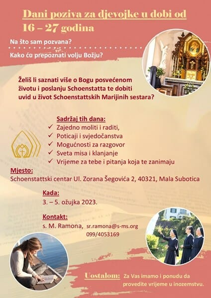 S ovim temama djevojke će se moći upoznati na Danima poziva za djevojke 16 – 27 godina koji će se održati od 3. do 5. ožujka 2023. Tih dana djevojke će zajedno moliti i raditi, slušat će poticaje i svjedočanstva, imati mogućnost za razgovor, prisustvovat u slavlju svete mise i euharistijskom klanjanju.
