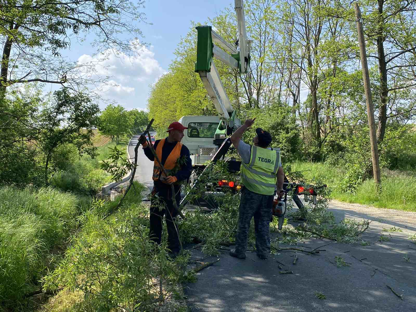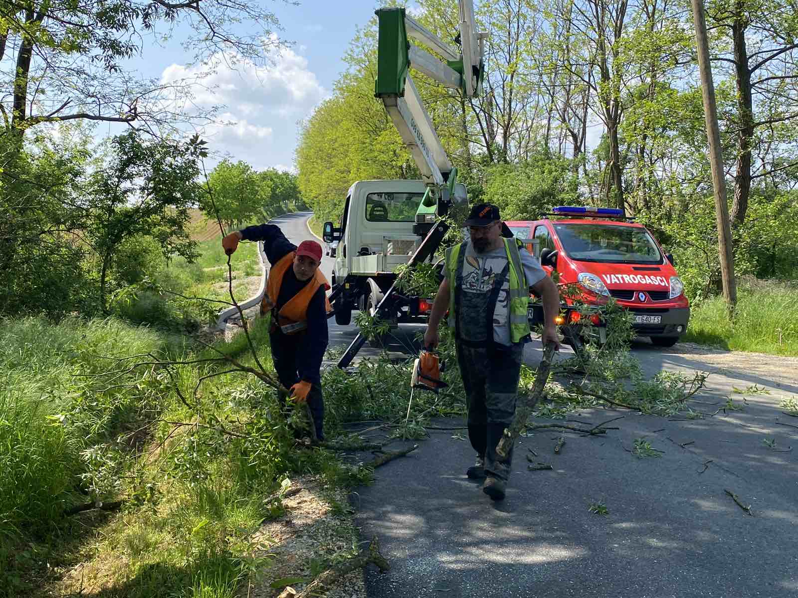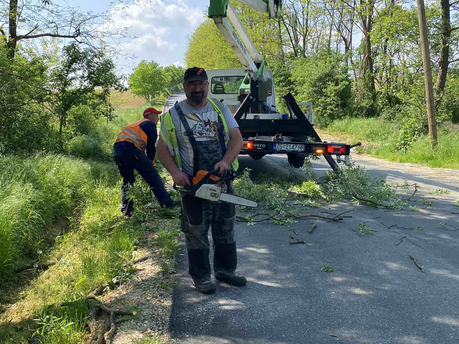 – Delamo ovih dana na području općine Sveti Juraj na Bregu. Idemo redom! Režemo grane koje dva ili više metra strše na cestu i predstavljaju problem za promet. Rezanje ide sporo, danas smo na cesti između Brezja i Malog Mihaljevca. Nije to tak jednostavno. Trebamo ustabiliti kamion, dignuti čoveka na dizalici, izrezati pilom grane, odsjeći ih, pa ih spustiti, pokupiti i izrezane odbaciti. Onda pak spustiti čovjeka dolje i sve iz početka deset metara dalje. Danas imamo četiri čovjeka u ekipi. Jedan signalizira promet, jedan reže grane na visini, drugi ustabiljuje kamion i dizalicu, a treći odbacuje i izrezuje grane, govori nam jedan od radnika.
