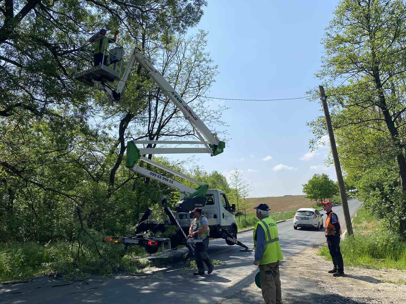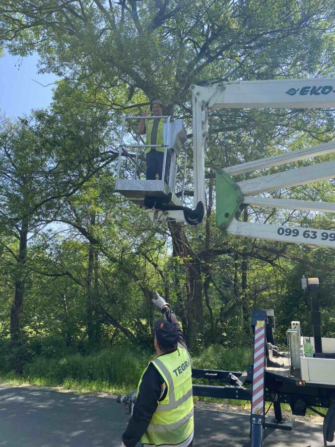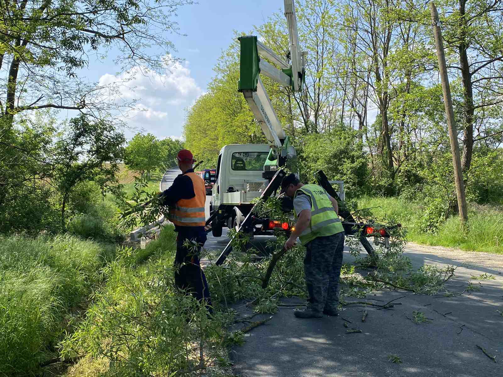 – Delamo ovih dana na području općine Sveti Juraj na Bregu. Idemo redom! Režemo grane koje dva ili više metra strše na cestu i predstavljaju problem za promet. Rezanje ide sporo, danas smo na cesti između Brezja i Malog Mihaljevca. Nije to tak jednostavno. Trebamo ustabiliti kamion, dignuti čoveka na dizalici, izrezati pilom grane, odsjeći ih, pa ih spustiti, pokupiti i izrezane odbaciti. Onda pak spustiti čovjeka dolje i sve iz početka deset metara dalje. Danas imamo četiri čovjeka u ekipi. Jedan signalizira promet, jedan reže grane na visini, drugi ustabiljuje kamion i dizalicu, a treći odbacuje i izrezuje grane, govori nam jedan od radnika.