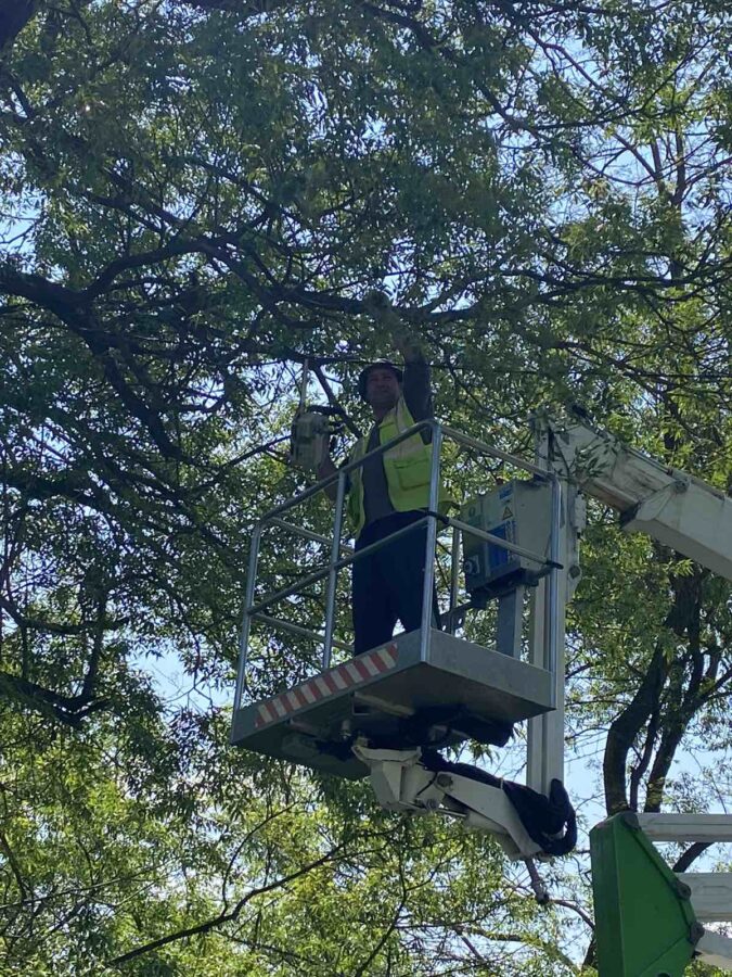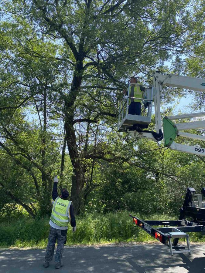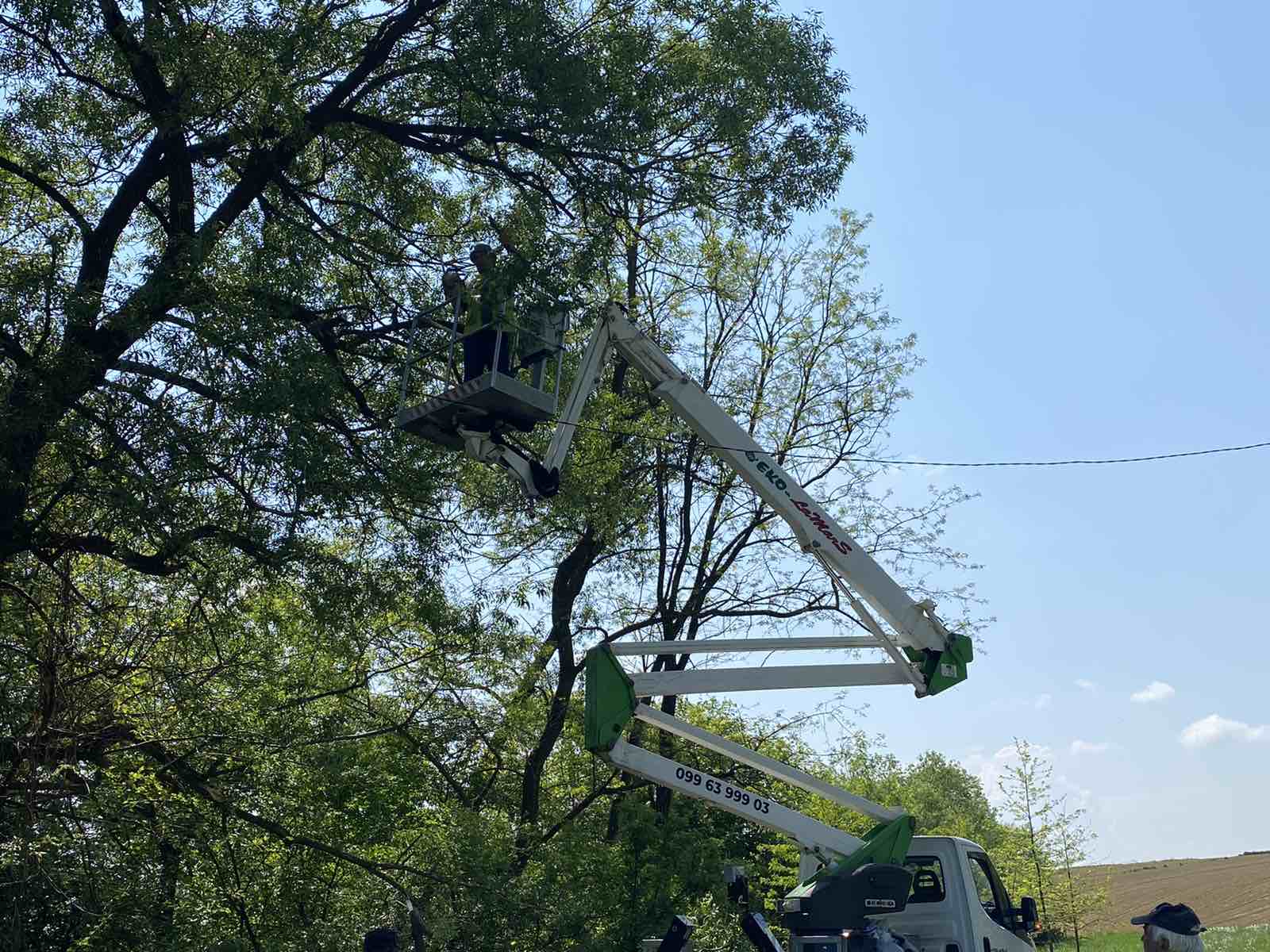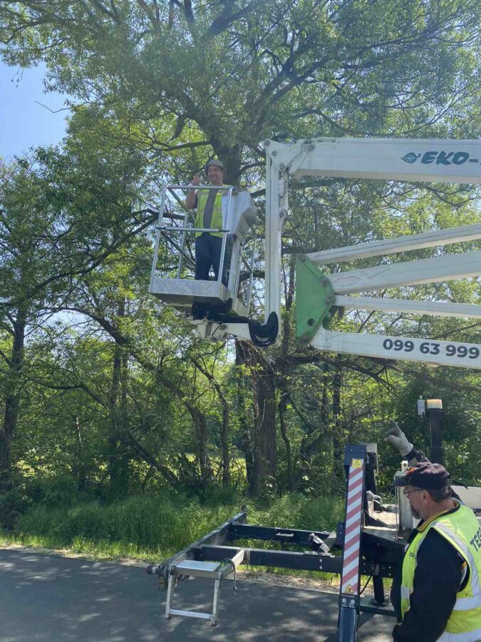 I dok njegovi radni kolege pomno promatraju i paze na svaki njegov pokret, Slobodan Majcen iz Trnovca diže se u zrak. Iz svoje kabine on povlači grane i reže ih motornom pilom.