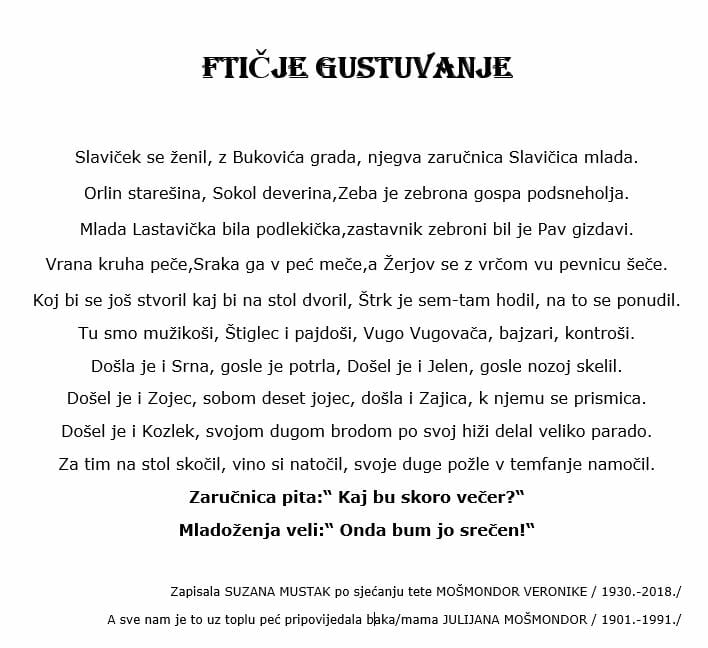 Kako je Suzanina teta Veronika jedna od rijetkih koja se sjećala pjesme koja se pjevala na Valentinovo (u originalu: ‘Slaviček se ženi’), Suzana je od nje naučila stihove te ih zapisala u pjesmici ‘Ftičje gustuvanje’ i odlučila ih podijeliti e-mailom s mještanima.
