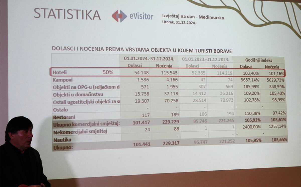 Od 1. siječnja do 31. prosinca 2024. godine, u registriranim smještajnim objektima na području Međimurske županije, evidentiran je 101.441 dolazak, od čega je 55.181 bilo domaćih, a 46.260 stranih gostiju. Te brojke pokazuju 6,88 posto više posjeta domaćih gostiju u odnosu na 2023., dok porast stranih turista iznosi 4,86 posto, odnosno lani je registrirano 5.694 gostiju više, odnosno 8.065 noćenja više.