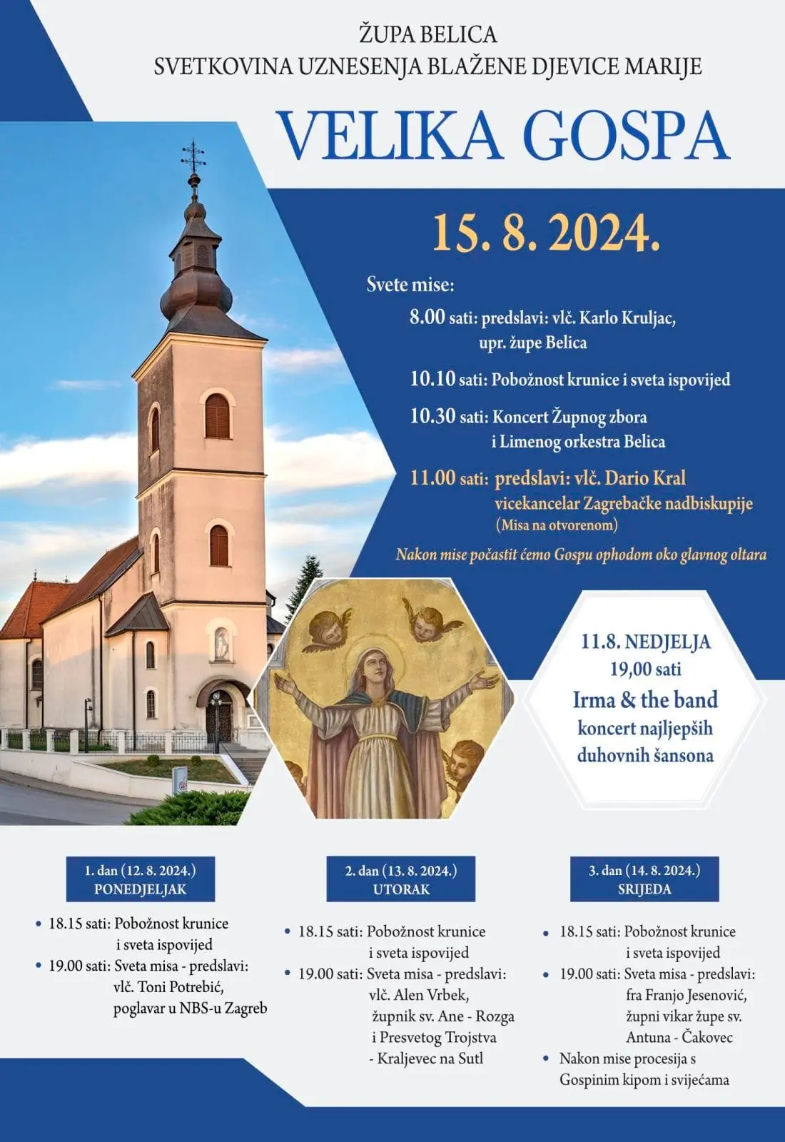 Za sam blagdan, dana 15. kolovoza kada misa započinje u 8:00 sati, u 10:30 sati održat će se koncert Župnog zbora i Limenog orkestra Belica. Nakon toga, slijedi misa na otvorenom tijekom koje će misno slavlje predvoditi vlč. Dario Kral (vicekancelar Zagrebačke nadbiskupije).