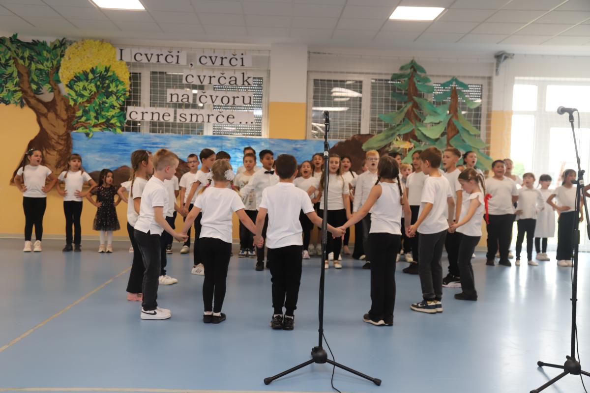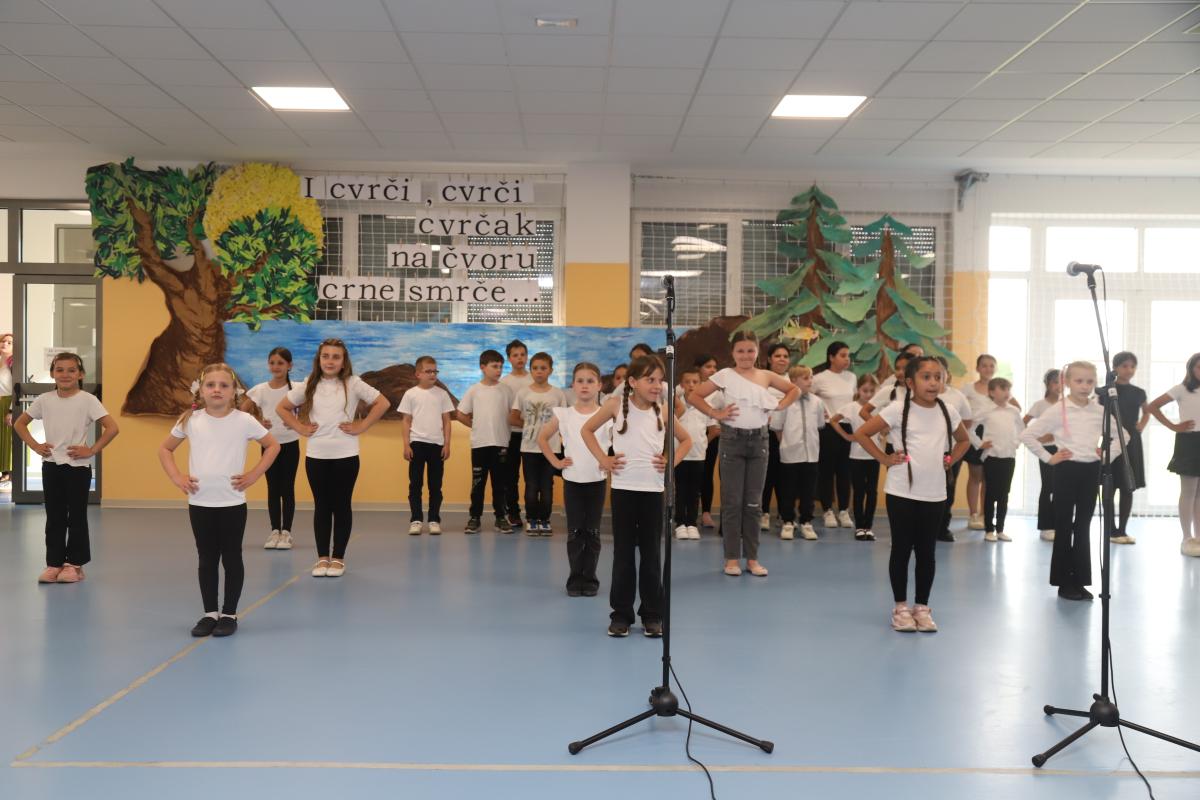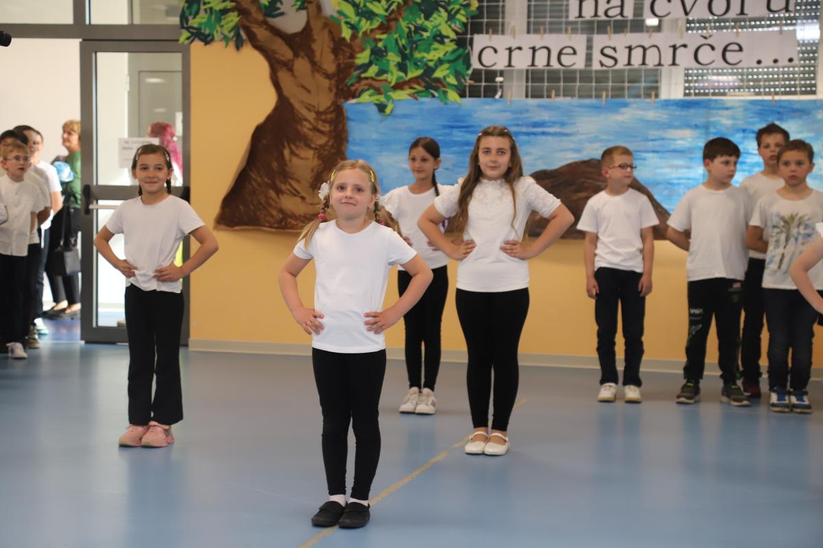 Uslijedio je nastup naših najmlađih – prvašića – koji su razveselili publiku recitacijom i pjesmicom. Učenici produženog boravka, okupljeni u mali folklor, izveli su razigran splet tradicionalnih pjesama, a svojim nastupom oduševili su i male i velike.