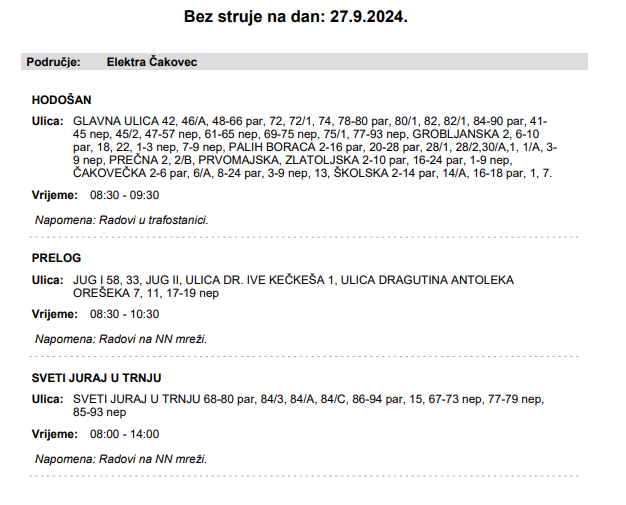 Iz HEP-a javljaju da 27. rujna električne energije neće biti u Svetom Juraju u Trnju i Hodošanu. Evo u kojim ulicama i u kojem vremenu: