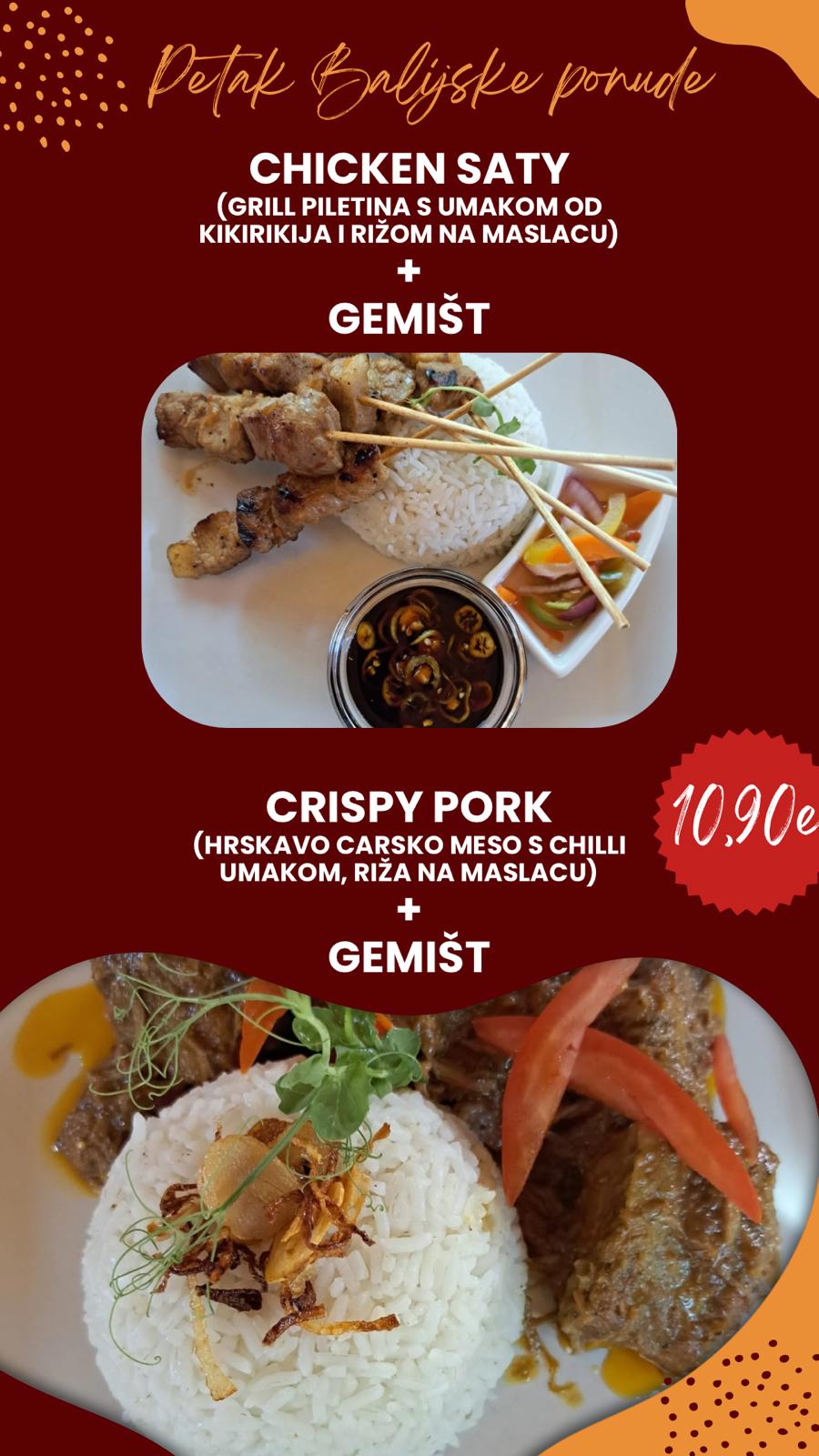 Petak, 8.3. – Chicken Satay + gemišt ili Crispy Pork + gemišt – 10,90€