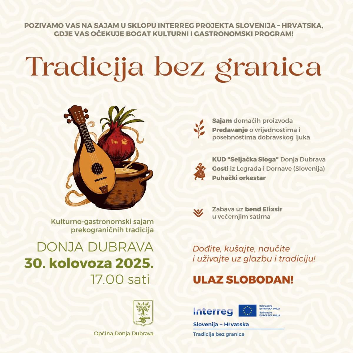 30.8. SUBOTA – KULTURNO-GASTRONOMSKI SAJAM PREKOGRANIČNIH TRADICIJA “TRADICIJA BEZ GRANICA“, MEĐUNARODNA MANIFESTACIJA, INTERREG PROJEKT HRVATSKA – SLOVENIJA