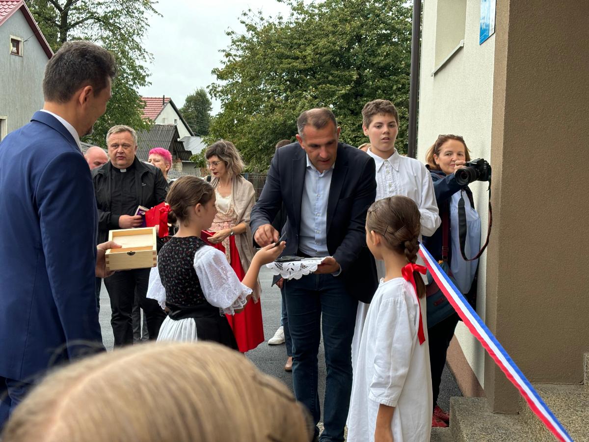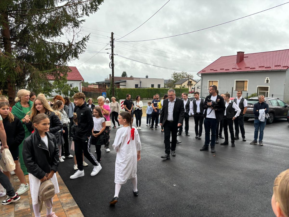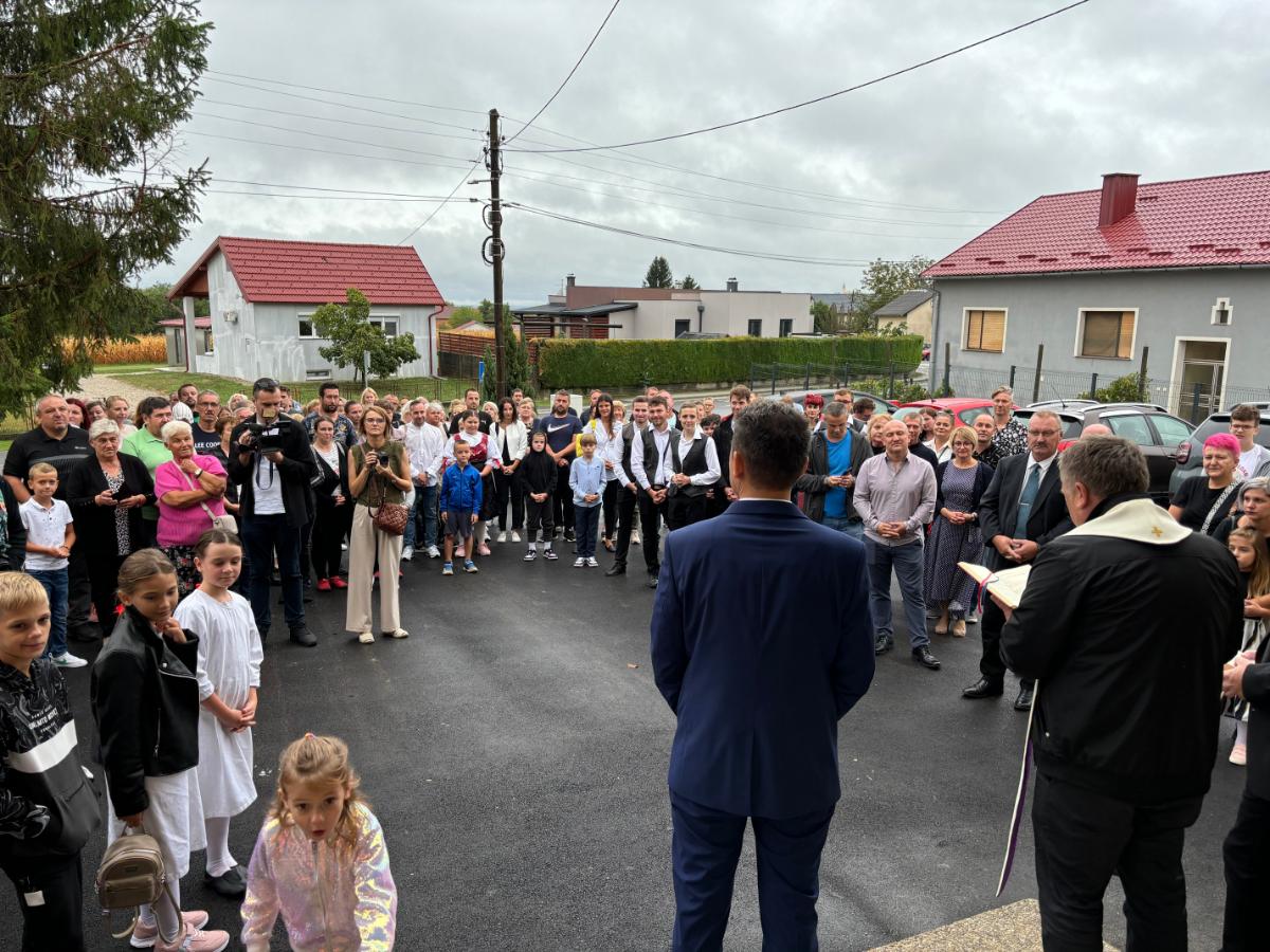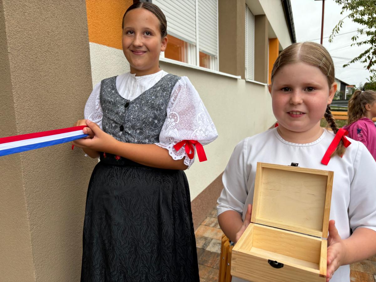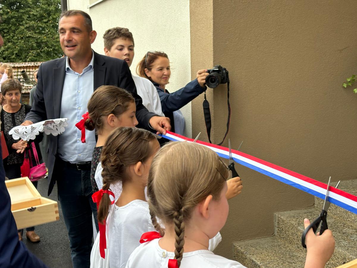 Svi okupljeni nakon svečane priredbe krenuli su prema školi koju je posvetio župnik Bistrović, a učenicima je pripala čast rezanja vrpce. Druženje se nastavilo u domu gdje je priređen domjenak.