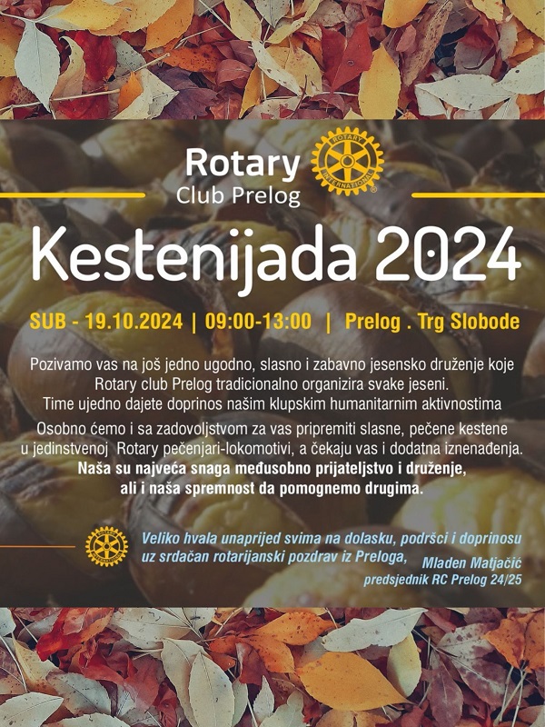 I ove godine Rotary club Prelog poziva na svoju tradicionalnu Kestenijadu, koja će se ove godine održati u subotu 19. listopada. „Pozivamo vas na još jedno slasno, ugodno i zabavno jesensko druženje koje Rotary club Prelog tradicionalno organizira svake jeseni.