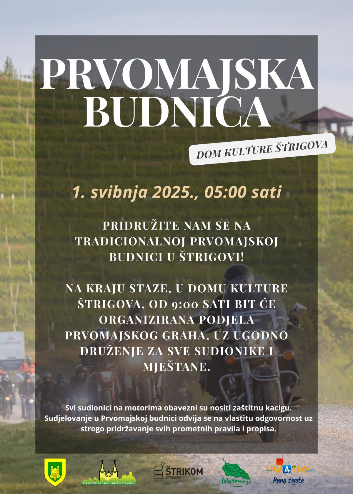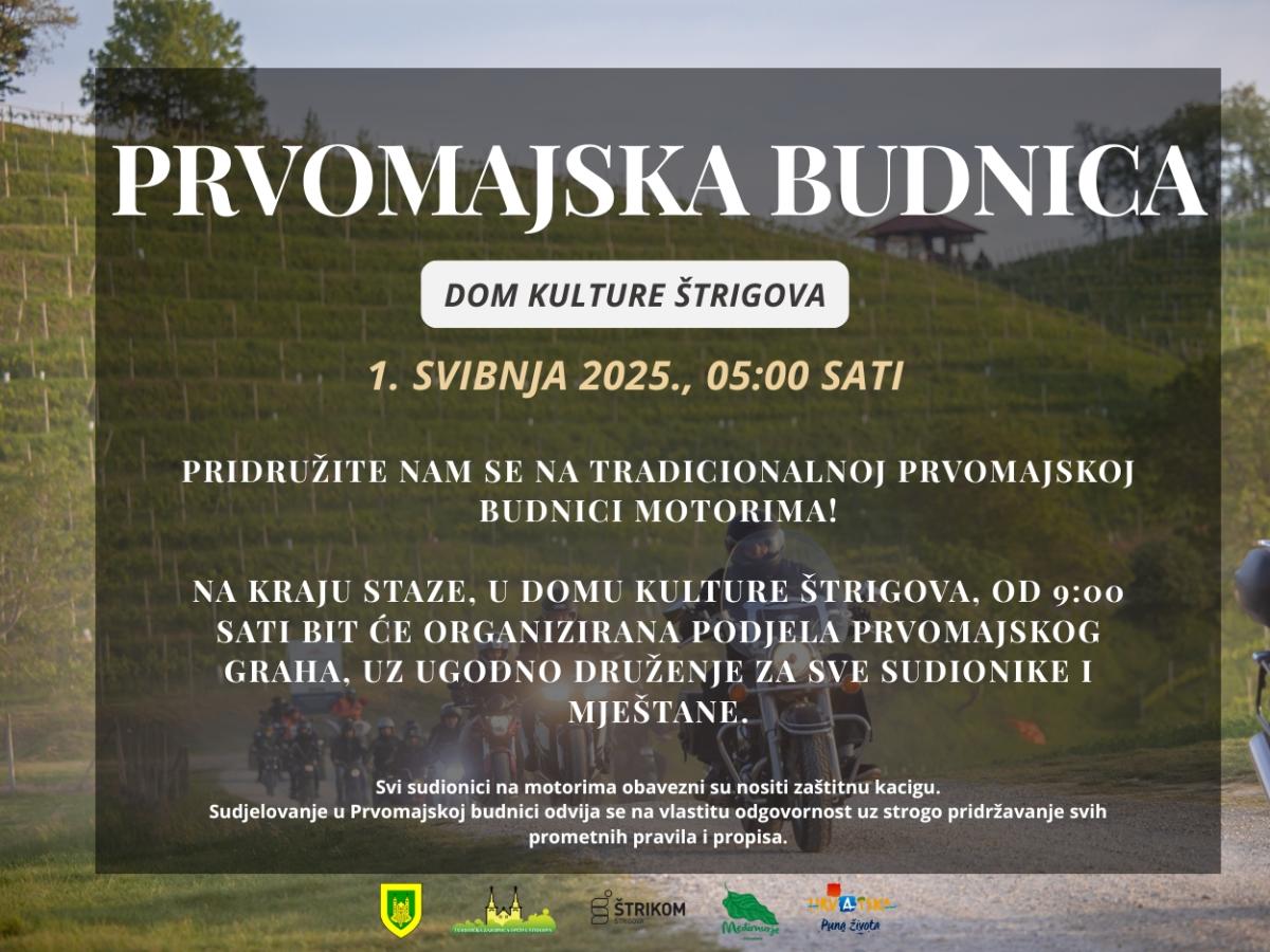 I ove će godine, u organizaciji Općine Štrigova, Turističke zajednice Općine Štrigova i komunalnog poduzeća Štrikom d.o.o., Prvi maj u Štrigovi započeti tradicionalnom Prvomajskom budnicom na motorima, koja je prošle godine okupila čak tristotinjak sudionika.