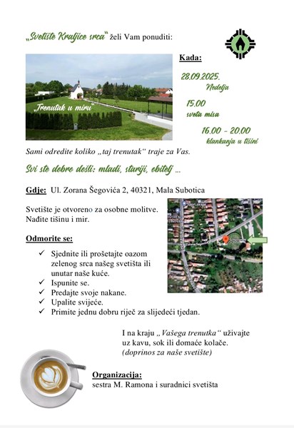 Svetište Kraljice srca u Maloj Subotici Hrvatske schönstattske obitelji nudi „Trenutak u miru“ u nedjelju 28. rujna 2025, javljaju iz Varaždinske biskupije.
