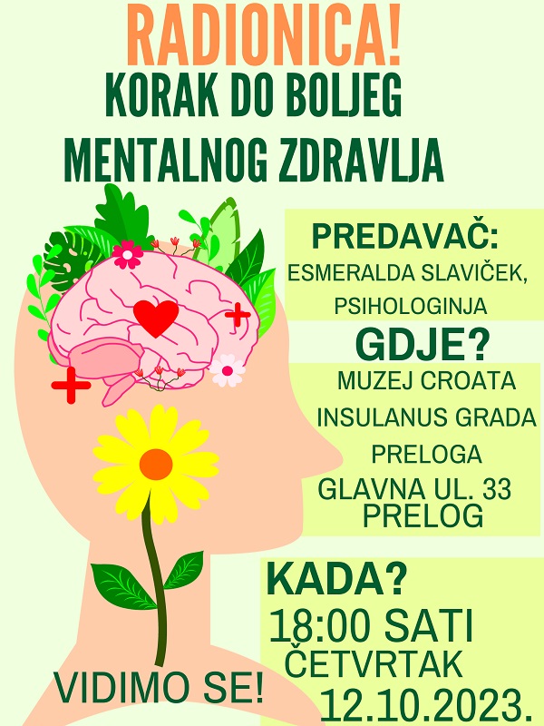 A kako doći do boljeg mentalnog zdravlja, možete saznati na radionici „Korak do boljeg mentalnog zdravlja“, koja će se održati u četvrtak, 12. listopada, u prostoru Muzeja Croata insulanus Grada Preloga. Radionicu će voditi i održati predavanje o mentalnom zdravlju, psihologinja Esmeralda Slaviček. Radionica je besplatna, a započinje u 18 sati.
