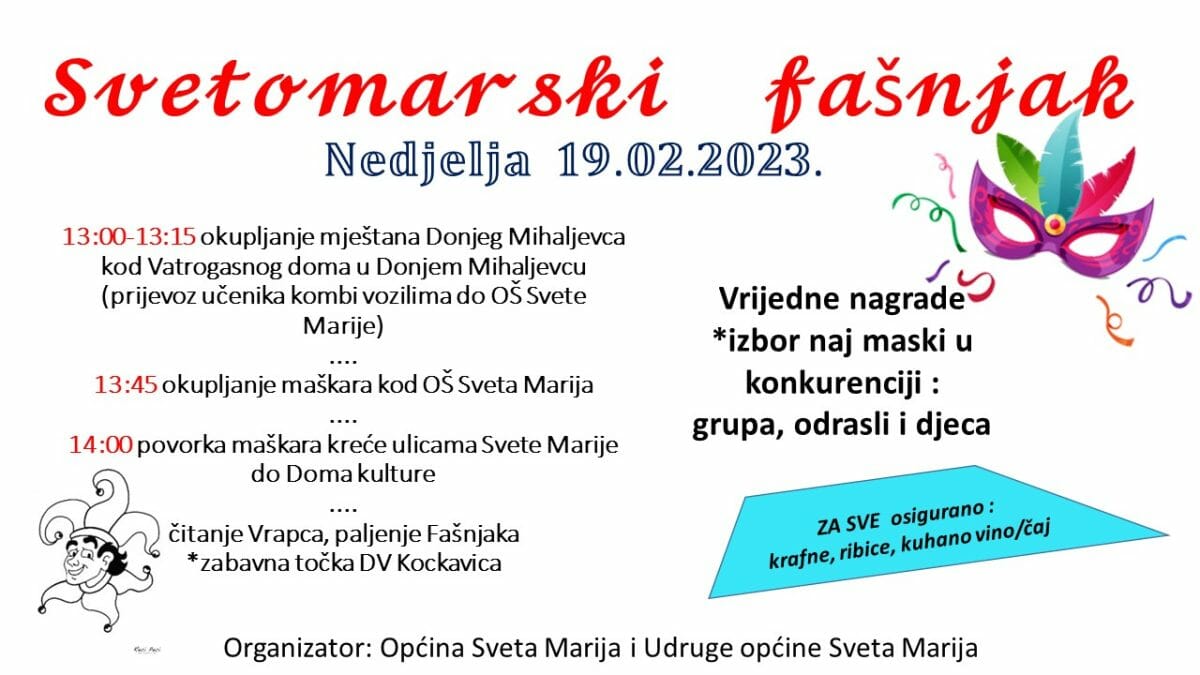 U nedjelju, 19. veljače 2022. godine, dođite na povorku i ples pod maskama „Svetomarski fašnjak“ koju organizira Odbor za turizam Općine Sveta Marija s općinskim udrugama.